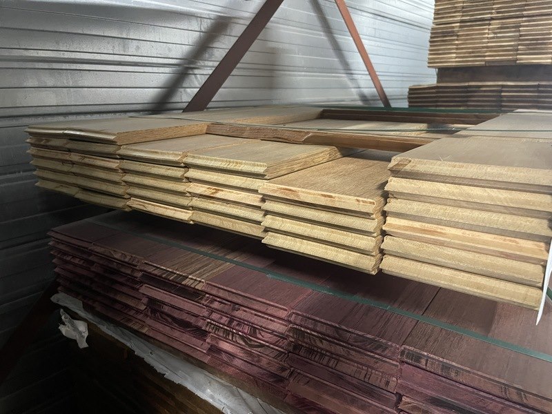 Product: Pakoeli kopse veer en groef (buitenparket) Materiaal: Pakoeli Afmeting: 21x145mm, lengte 100cm Conditie: nieuw