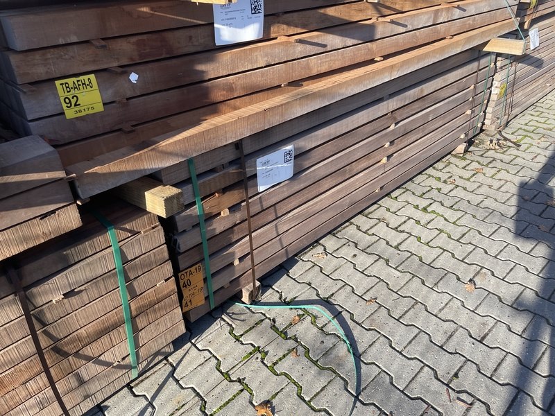 Product: Guyana Teak palen fijnbezaagd Materiaal: Basralocus Afmeting: 68x68mm, lengte 275cm Conditie: nieuw