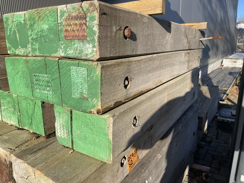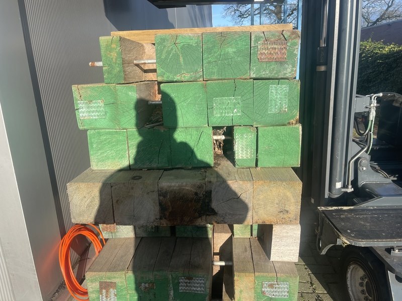Product: Guyana Teak dragline schotten Materiaal: Basralocus Afmeting: diverse afmetingen, lengte 180cm-200cm Conditie: gebruikt