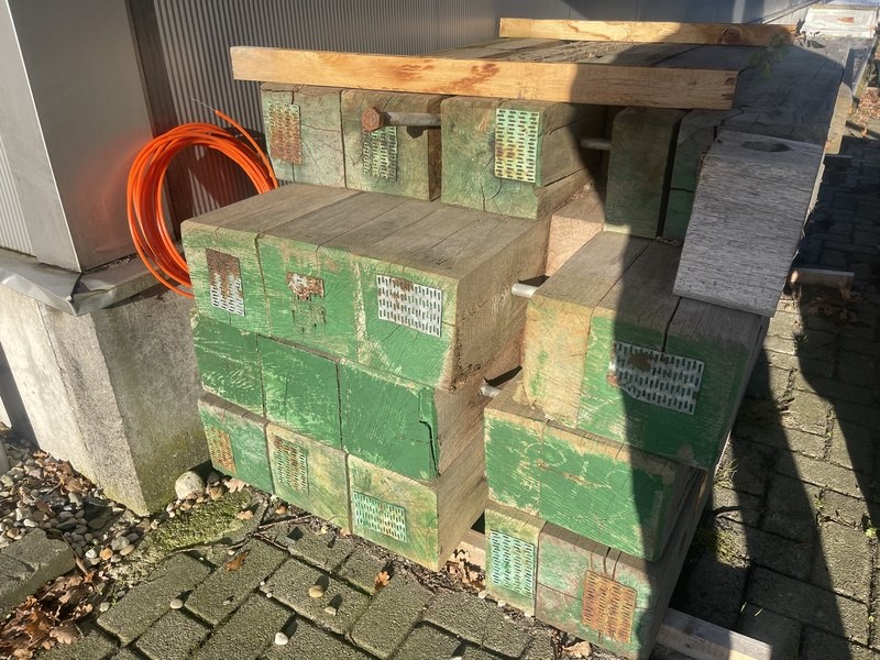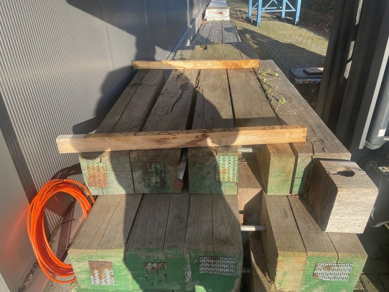 Product: Guyana Teak dragline schotten Materiaal: Basralocus Afmeting: 20x100mm, lengte 1/165cm, 3/200cm Conditie: gebruikt