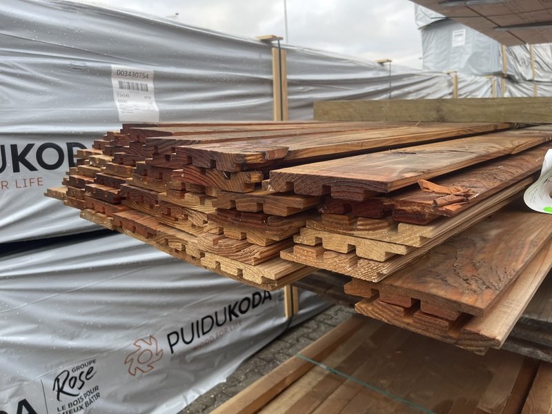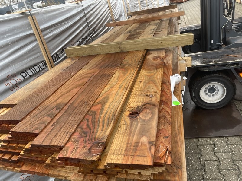 Product: Douglas Design- Triple- Deens profiel Materiaal: Douglas Afmeting: 22x142mm, lengte 500cm Conditie: gebruikt
