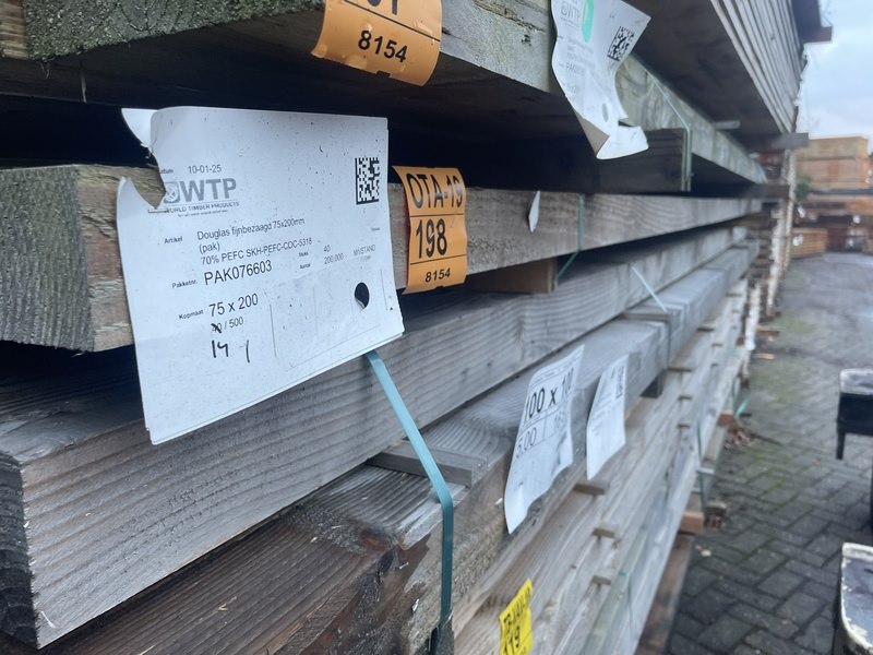 Product: Douglas balken fijnbezaagd Materiaal: Douglas Afmeting: 75x200mm, lengte 500cm Conditie: gebruikt