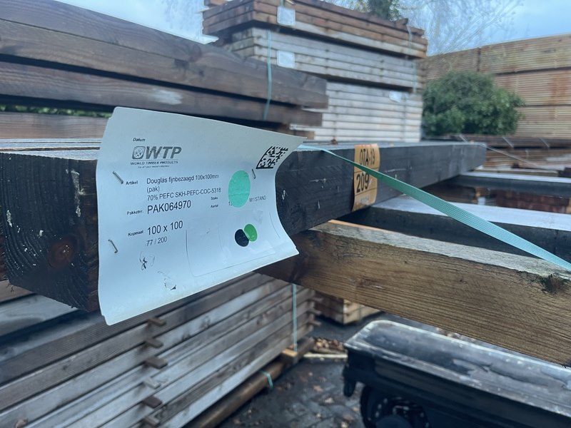 Product: Douglas balken fijnbezaagd Materiaal: Douglas Afmeting: 100x100mm, lengte 200cm Conditie: gebruikt
