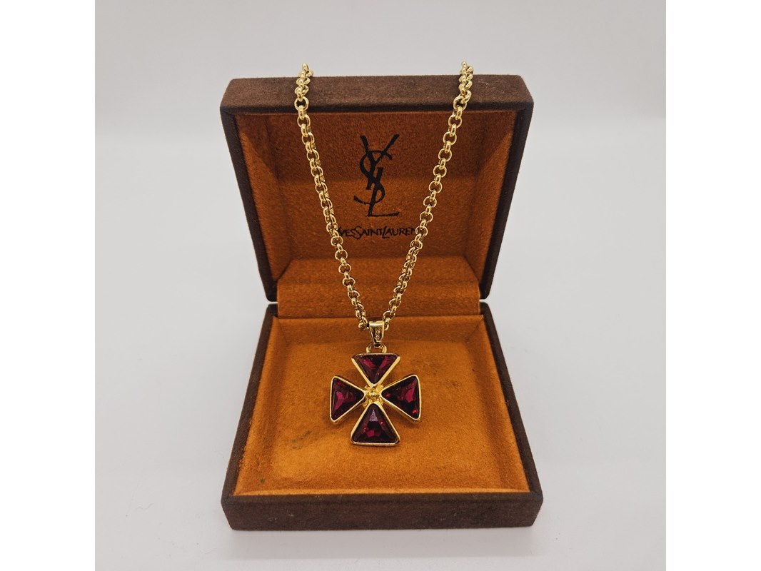 Product: Yves Saint Laurent dikke goldplated collier met robijn stijl pendant Specificaties: Nieuw uit oude voorraad. Goldplated, met kruisvormige pendant, met robijn stijl stenen, geen echte robijnen. Inclusief YSL doos. Merk: Yves Saint Laurent. Totale lengte inclusief sluiting: 53cm.