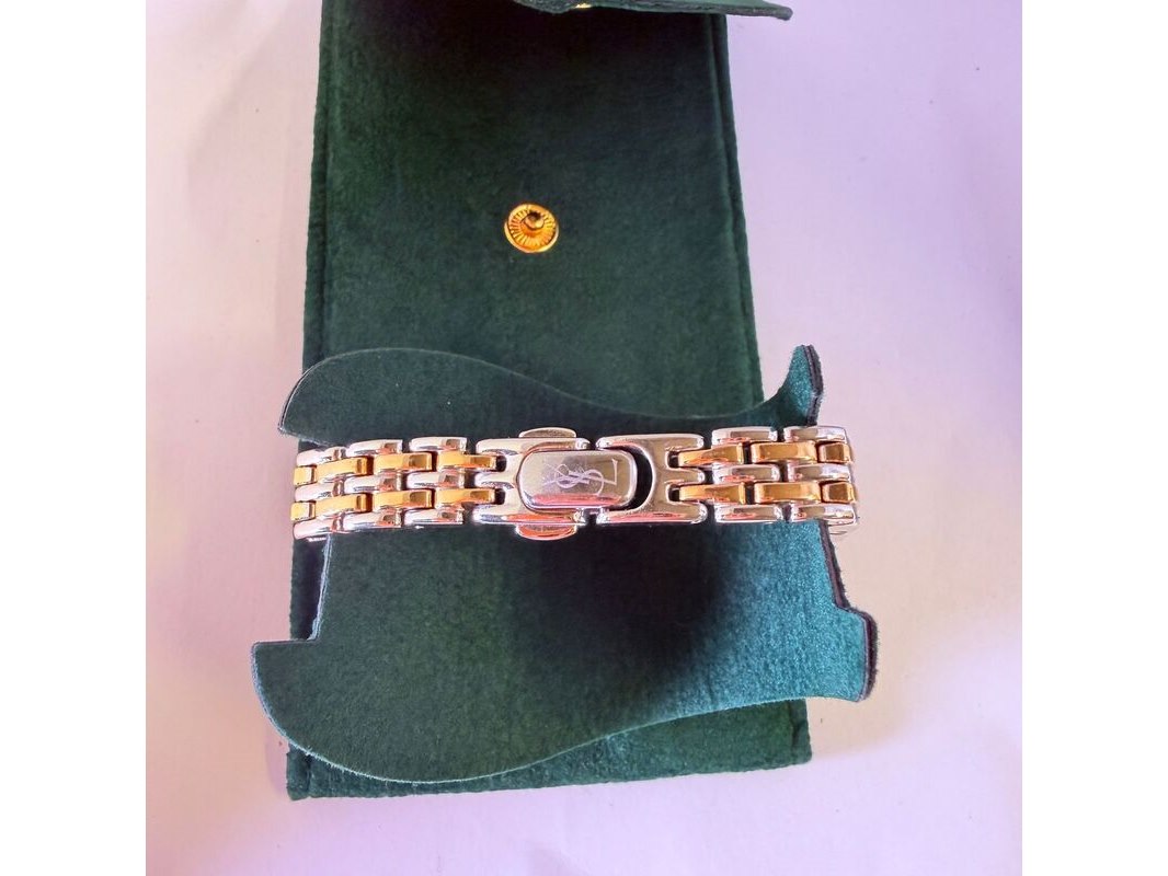 Product: Yves Saint Laurent horseshoe dameshorloge - Model 7D0055 Afmeting: 24mm Conditie: Gebruikt Specificaties: Staal en goldplated. Inclusief juweliers etui. Werkend getest onder quartz-tester, heeft een nieuw batterijtje nodig. Polsmaat: 14cm-15cm