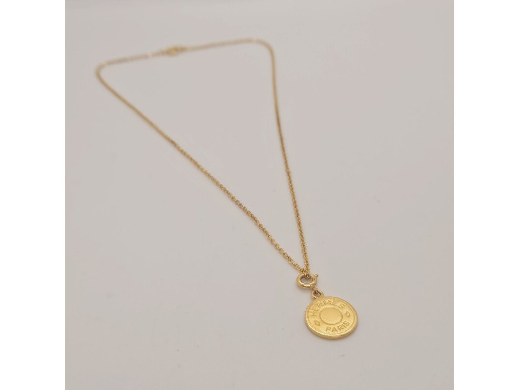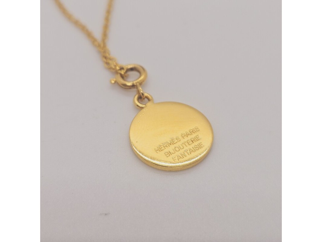 Product: Hermes goldplated pendant op collier Conditie: Gebruikt Specificaties: Pendant van Hermes. De collier is later toegevoegd en hoort niet origineel bij de pendant. Totale lengte collier: 45cm Diameter pendant: 14mm