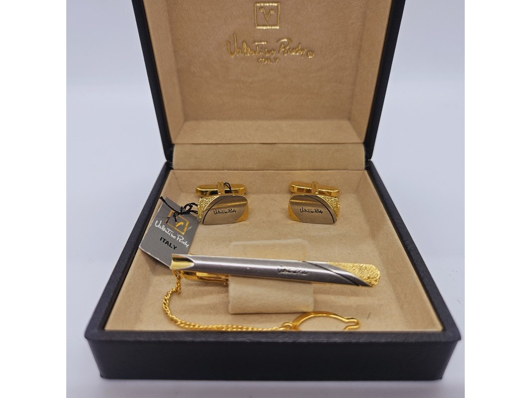 Product: Valentino Rudy manchetknopen + tie pin Conditie: Gebruikt Specificaties: Frosted two tone model. Merk: Valentino Rudy. Inclusief doos.