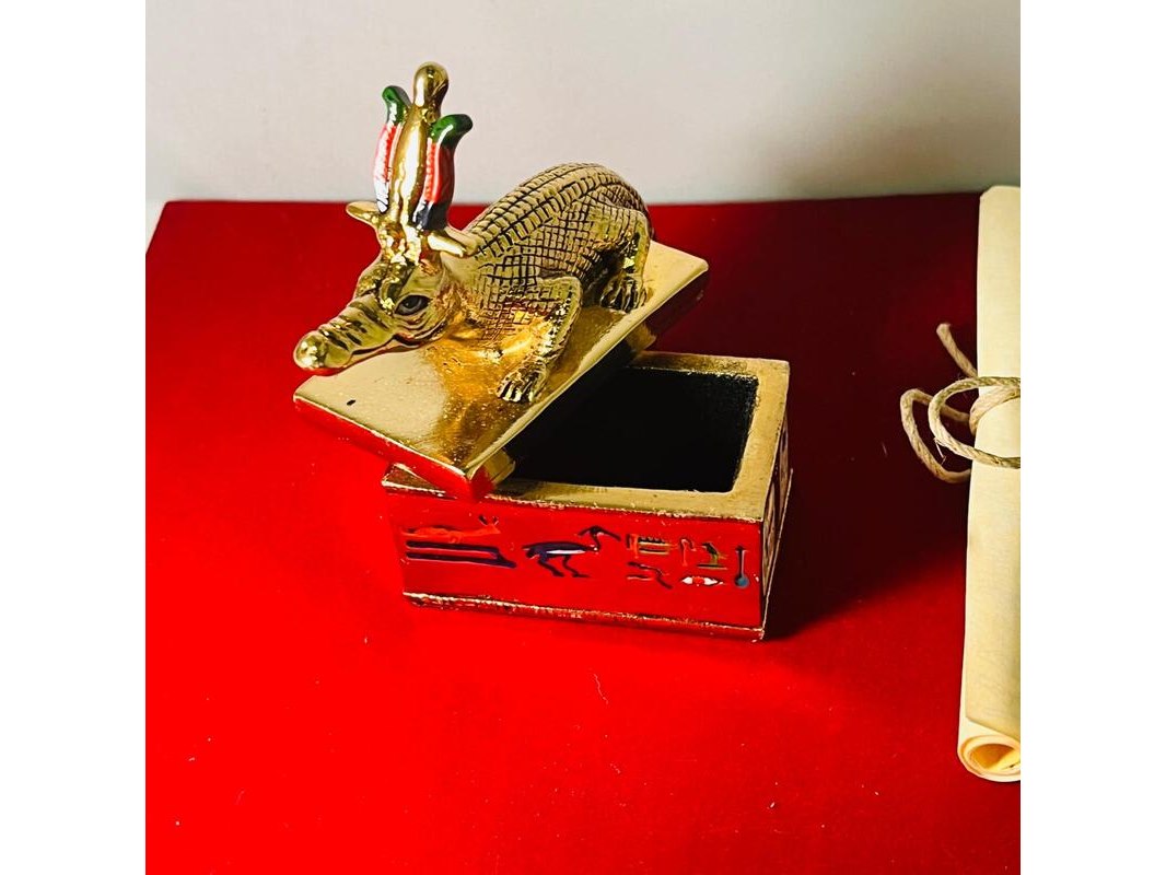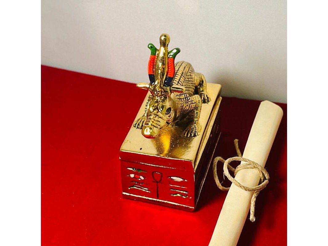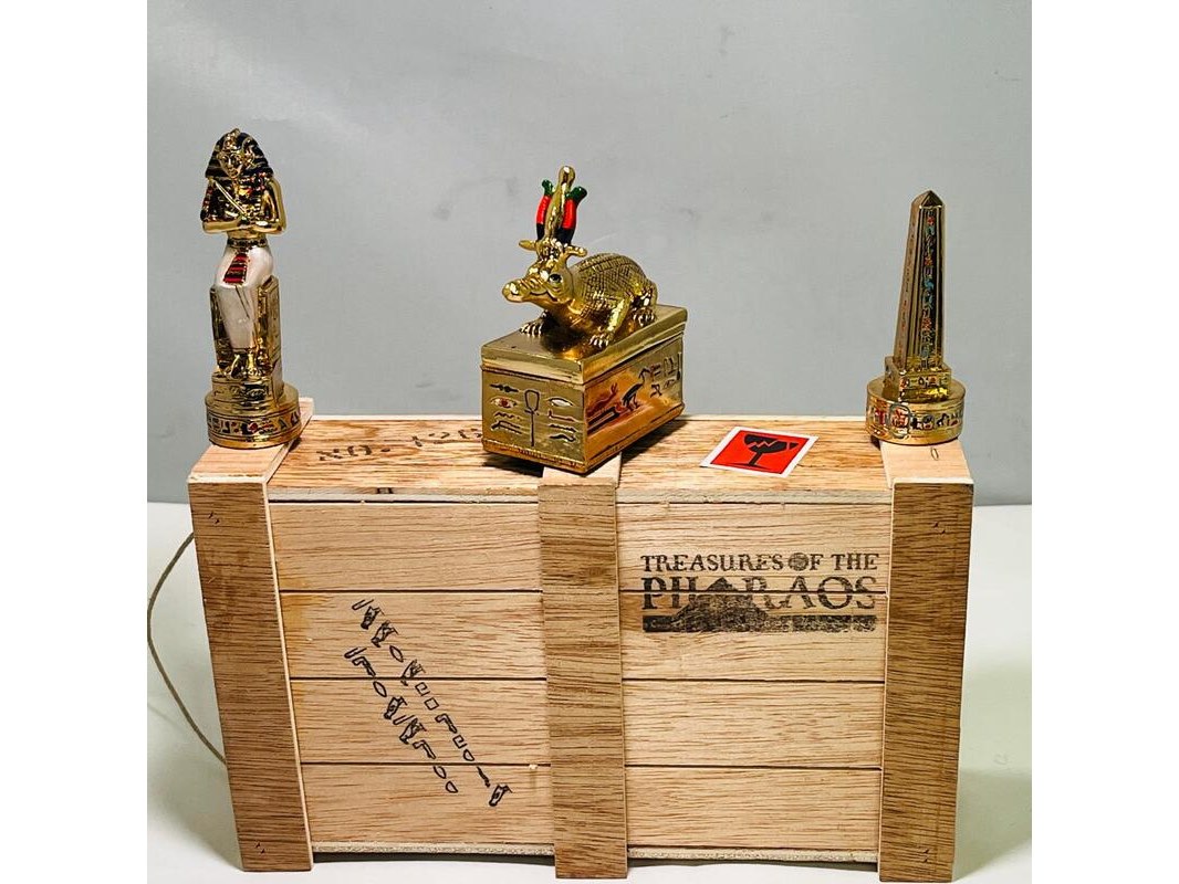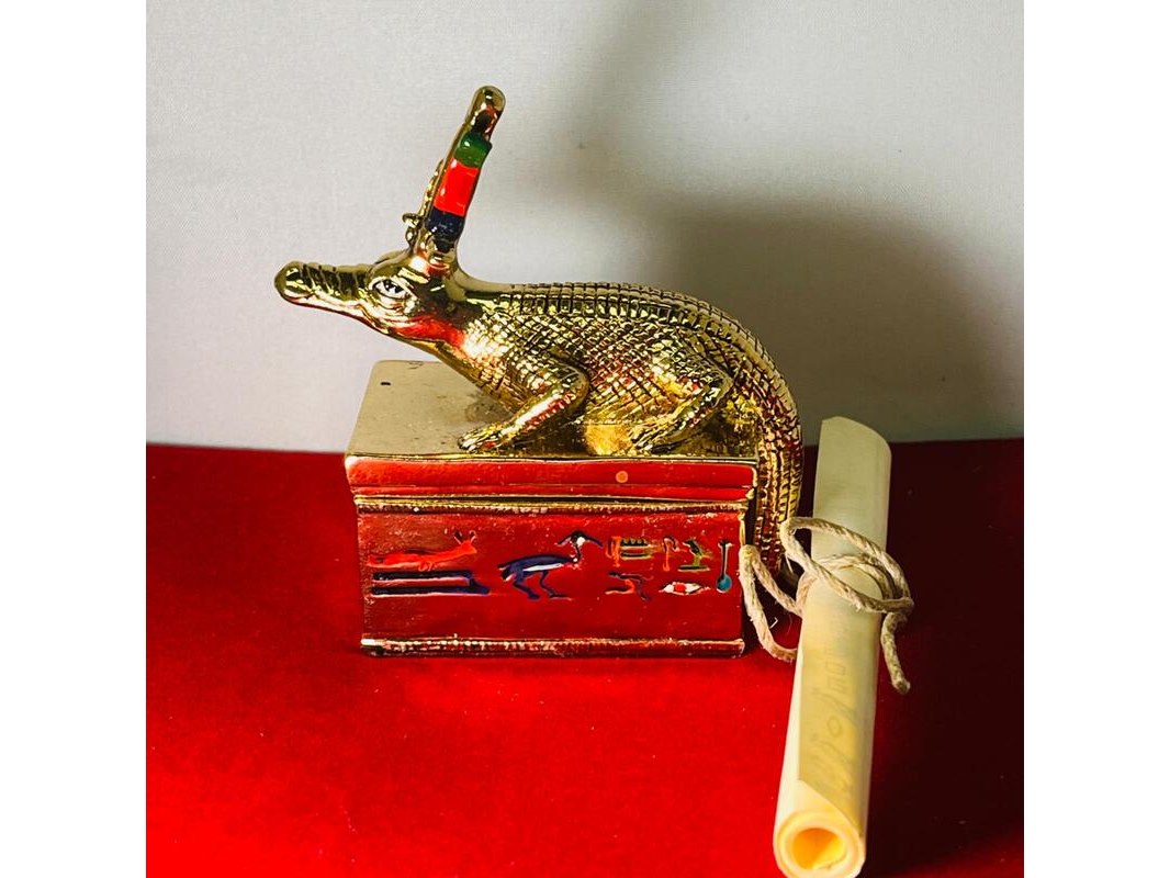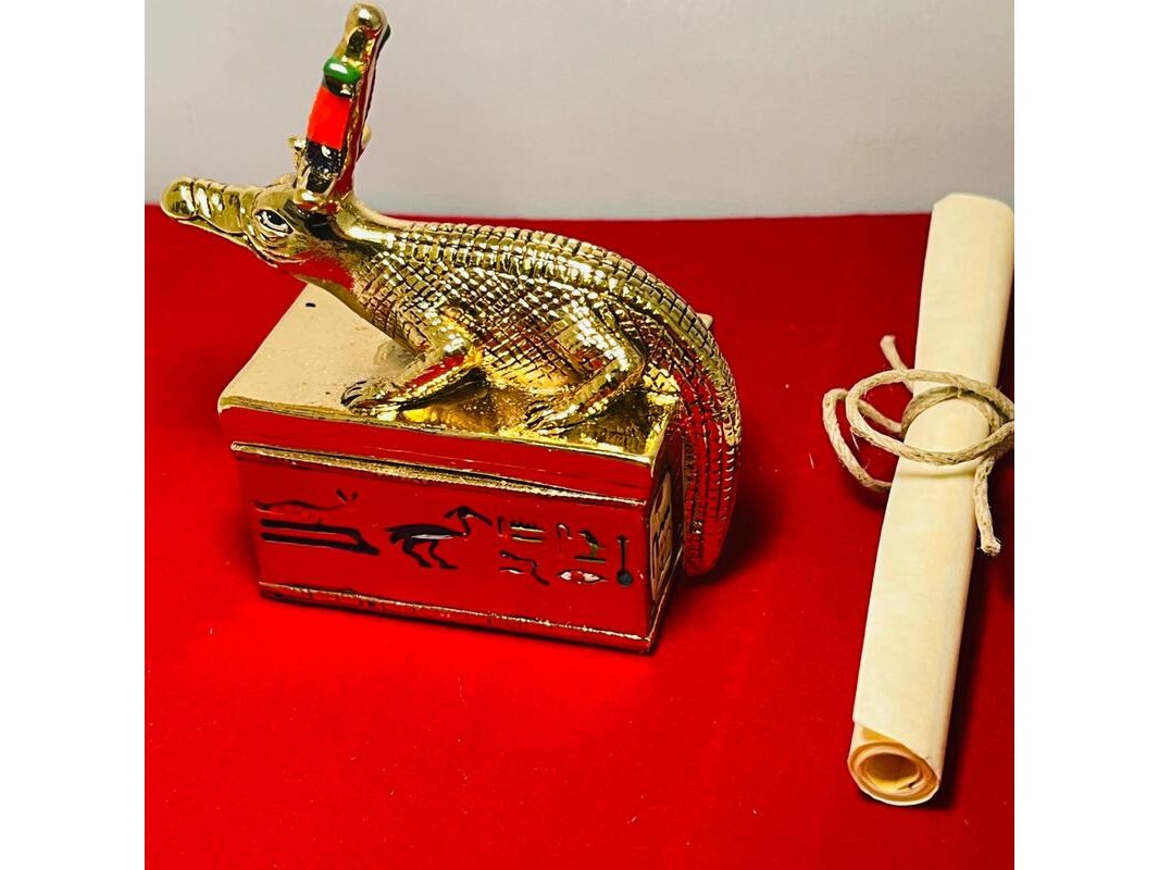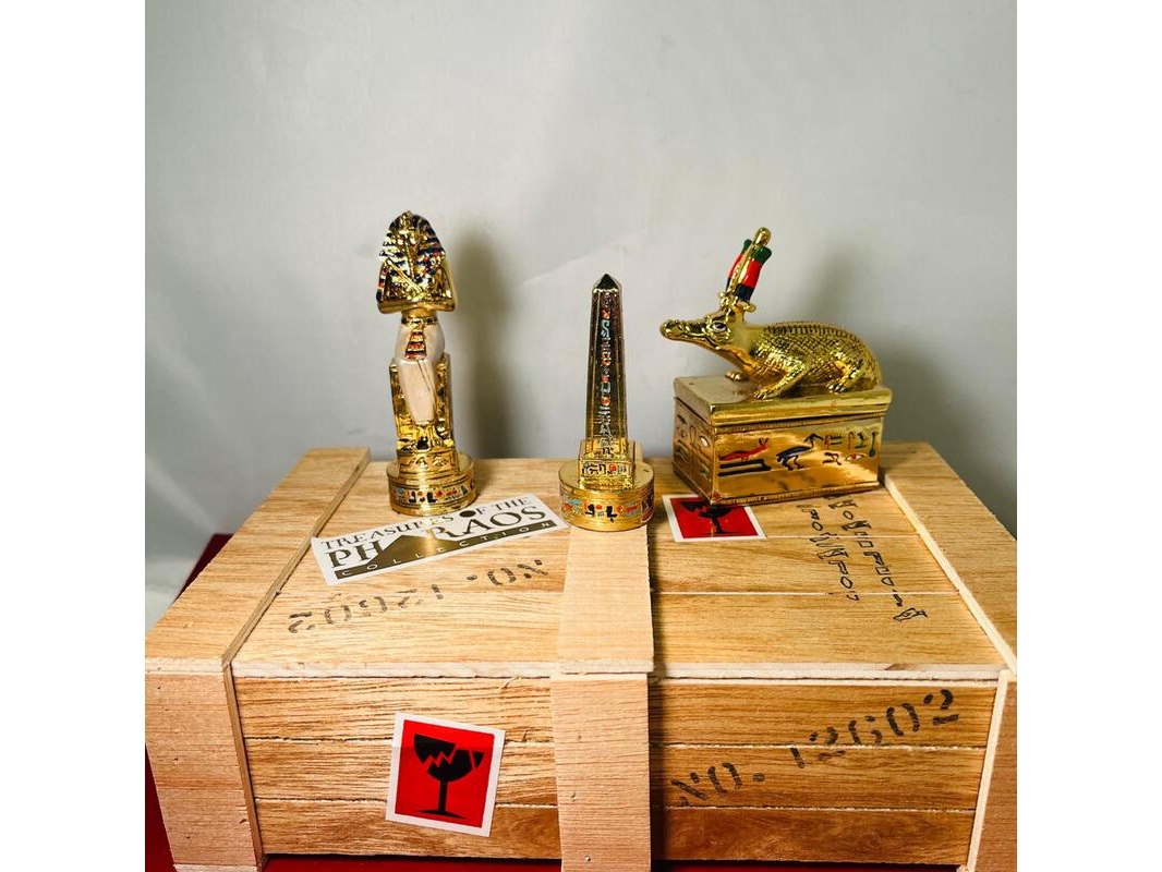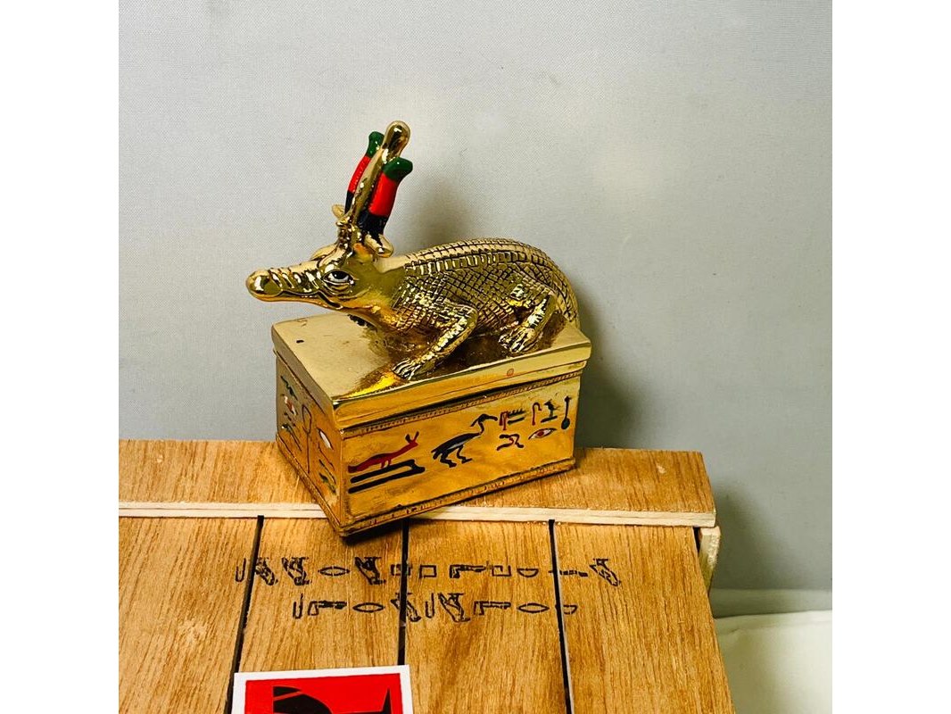 Product: Farao, Obelisk en Sobek Egyptische kunstgouden beelden Conditie: Nieuw Specificaties: Met authentieke houten verzendkist. Verzamelaars editie van Egypt Foundation Caïro. Let op!! Beelden zijn zwaar en niet hol. De kist wordt gesloten in mint conditie geleverd met de beelden erin, en is gesealed. Een echte verzamelaarseditie die alleen open kan door het hout te breken.