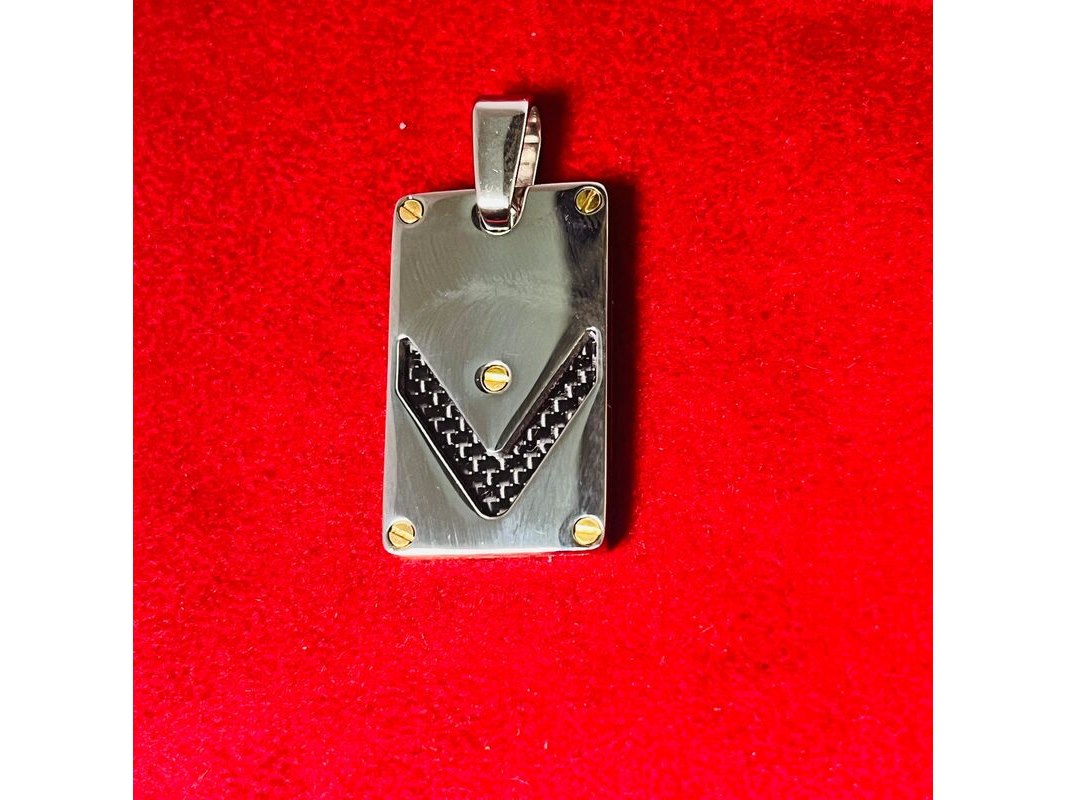 Product: Heren Dogtag Pendant - Goldplated Santos model black carbon Afmeting: ca. 17mm x 29mm Conditie: Gebruikt Specificaties: Dogtag heren pendant, goud met staal Santos model, met een Carbon V van Vanderbilt University.