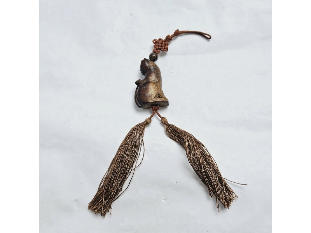 Antieke netsuke houten figurine met paarse jade