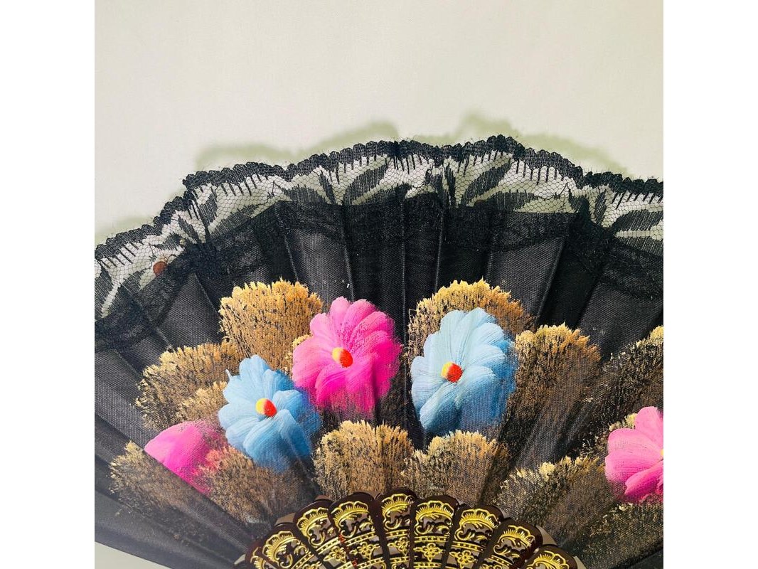 Antieke waaier - black flowers - bakeliet handvat - mint conditie