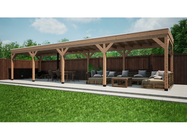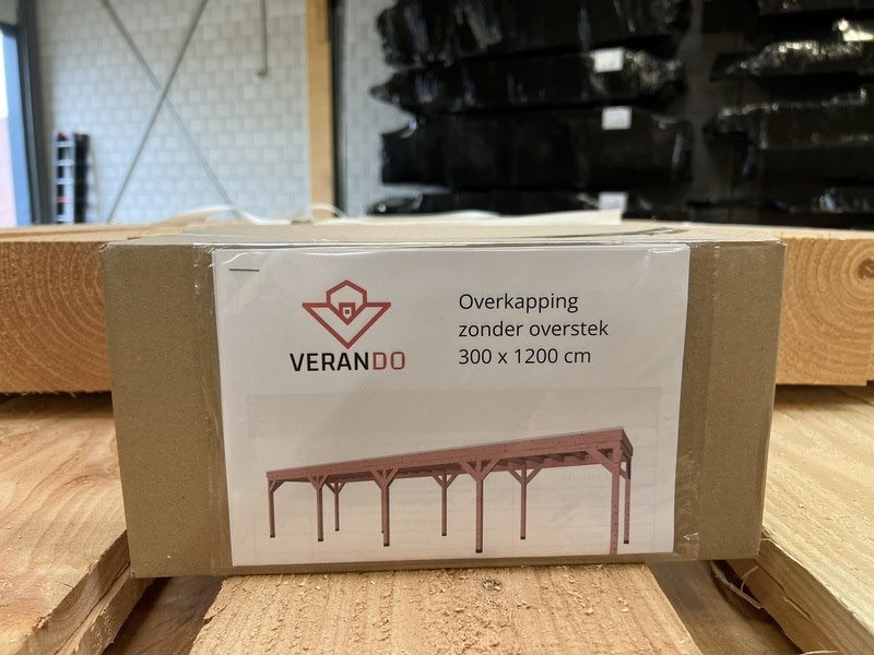 Merk: Verando Product: Douglas overkapping 300x1200cm Materiaal: Douglashout Conditie: nieuw Specificaties: Deze overkapping bestaat uit hoogwaardige, bezaagde, Europese, Douglas houten onderdelen en wordt geleverd als een compleet pakket inclusief bevestigingsmaterialen en een duidelijke, stapsgewijze handleiding voor de montage. Specificaties: •Palen van 12 × 12 cm •Ringbalk van 5 × 15 cm (bij 400 cm diepte 7,5 x 17,5 cm) •Balklaag van 5 x 15 cm •Dakbeschot van 1,8 cm •Boeiboorden van 2,5 × 20 cm •Schoren van 5 × 15 cm •Bezaagd Europees Douglas hout •Inclusief alle benodigde bevestigingsmaterialen •Heldere en gebruiksvriendelijke montagehandleiding