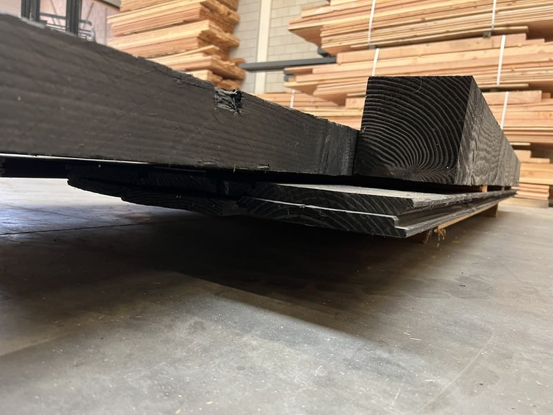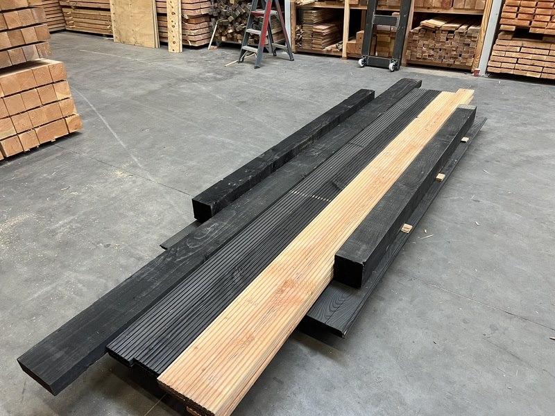 Product: Div. zwart en blank Douglas hout Materiaal: Douglashout Specificaties: 2 st 150x150x2500mm zwart bezaagd, 1 st 75x220x4500mm zwart bezaagd, 4 st vlonderplank 28x145x4000mm zwart, 5 st vlonderplank 28x145x4000mm blank Douglas, 10 st halfhoutprofiel 18x190x3000 zwart Douglas