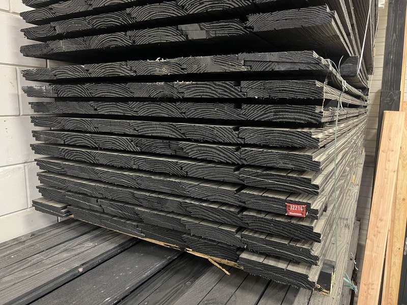 Product: Zweeds rabat zwart gedompeld, lengte: 300cm Materiaal: Douglashout Conditie: nieuw Specificaties: 60 st zweeds rabat zwart gedompeld, 12/28x195mm werkende breedte 175mm