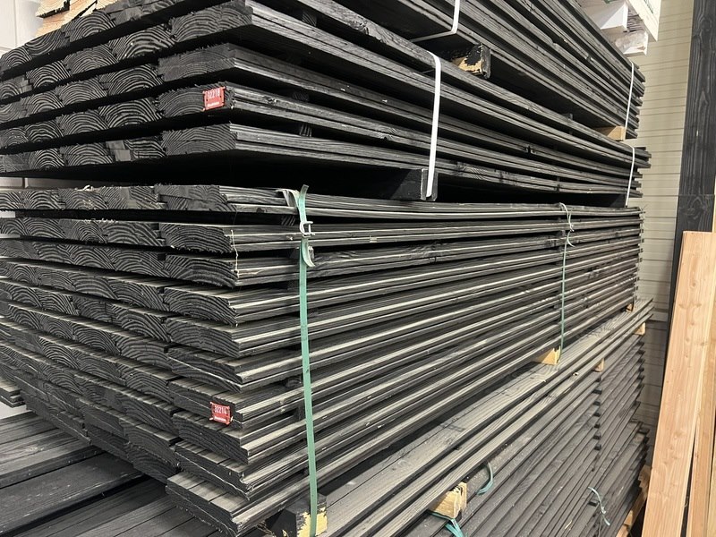 Product: Zweeds rabat zwart gedompeld, lengte: 400cm Materiaal: Douglashout Conditie: nieuw Specificaties: 60 st zweeds rabat zwart gedompeld, 12/28x195mm werkende breedte 175mm