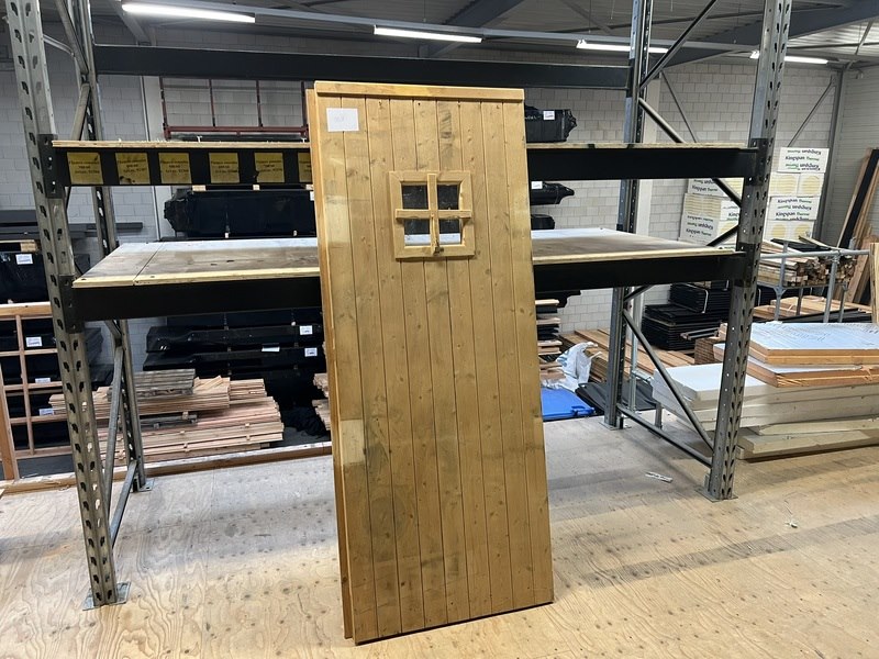 Merk: Hillhout Product: Vuren deur met glas 760x1920mm Specificaties: Afmetingen: 760x1920mm, met glas