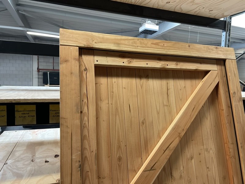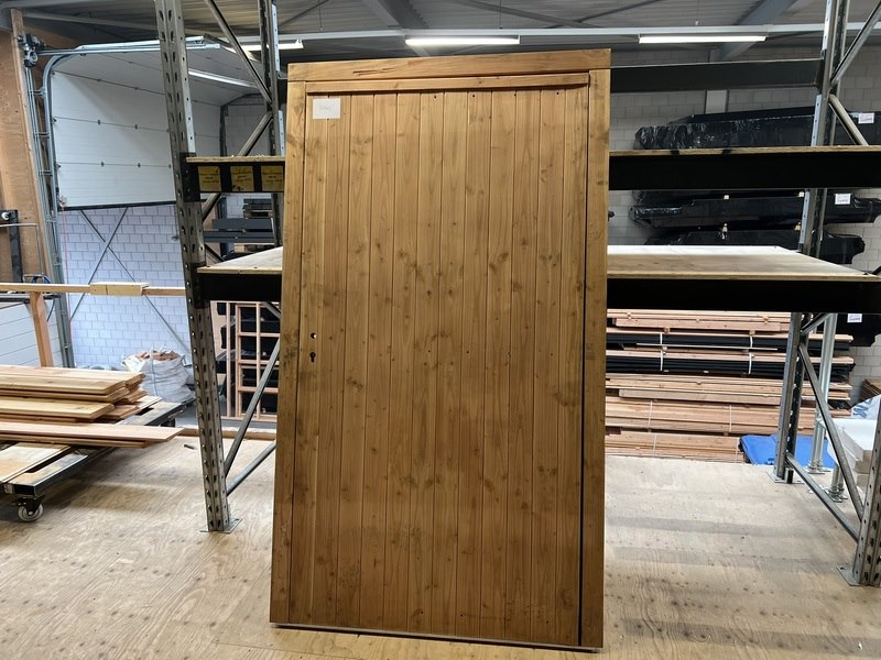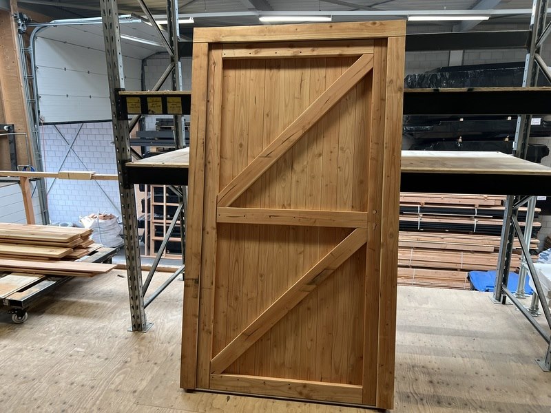 Merk: Hillhout Product: Douglas deurkozijn Materiaal: Douglashout Specificaties: Afmetingen: 1190x2090mm, excl. hang en sluitwerk, Rechts draaiend
