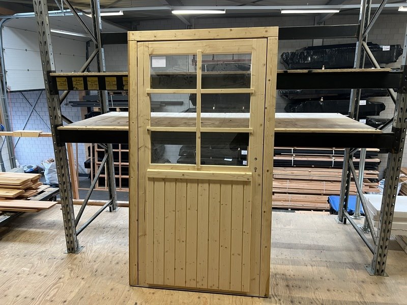 Merk: Hillhout Product: Vuren deurkozijn, glas gebarsten Materiaal: Vurenhout Specificaties: Afmetingen: 1120x2010mm, excl. hang en sluitwerk, glas gebarsten, links draaiend