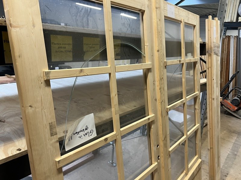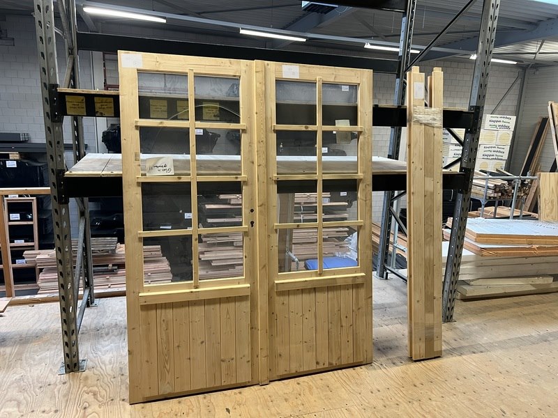 Merk: Hillhout Product: Vuren dubbel deurkozijn Materiaal: Vurenhout Specificaties: Afmetingen: 1685x2010mm, gebarsten glas, excl. hang en sluitwerk