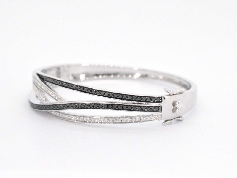 Product: Witgouden design armband met witte en zwarte briljanten diamanten Specificaties: Diamant: Natuurlijk Slijpvorm: Briljant geslepen Gewicht (carat): 2.00 carat Kleur: Hoog wit (F-G) en zwart (enhanced) Zuiverheid: VS Slijpkwaliteit: Zeer mooi Juweel: Armband Gewicht: 23.5 gram Afmetingen/lengte: Maat: 60 mm Materiaal: 18K goud (750) Conditie: Nieuw Verpakking: Luxe sieradendoos Toelichting: De kwaliteit is overgenomen van het rapport behorend bij item. De waardebepaling is een beoordeling van een gecertificeerde diamantair, gebaseerd op consumentenprijzen. Consumentenprijs: € 17.150,- *Ring kan als het mogelijk is op maat gemaakt worden.