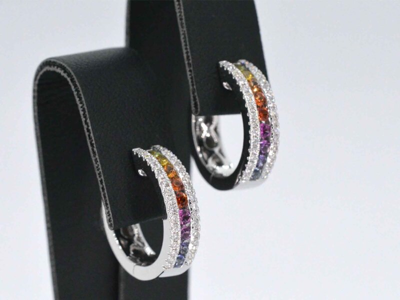 Product: Witgouden oorbellen met multi colour saffieren en diamanten Specificaties: Diamant: Natuurlijk Aantal: 68 stuks Slijpvorm: Briljant geslepen Gewicht (carat): 0.35 carat Kleur: F-G Zuiverheid: VS Slijpkwaliteit: Zeer mooi Edelsteen: Saffieren Aantal: 18 stuks Slijpvorm: Briljant geslepen Gewicht (carat): 0.70 carat Kleur: Multicolour Slijpkwaliteit: Very good Juweel: oorbellen Gewicht: 7 gram Afmetingen/lengte: 1,5cm Materiaal: 18K goud (750) Conditie: Nieuw Verpakking: Luxe sieradendoos Toelichting: De kwaliteit is overgenomen van het rapport behorend bij item. De waardebepaling is een beoordeling van een gecertificeerde diamantair, gebaseerd op consumentenprijzen. Consumentenprijs: € 6.930,- *Ring kan als het mogelijk is op maat gemaakt worden.