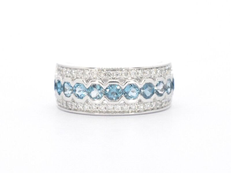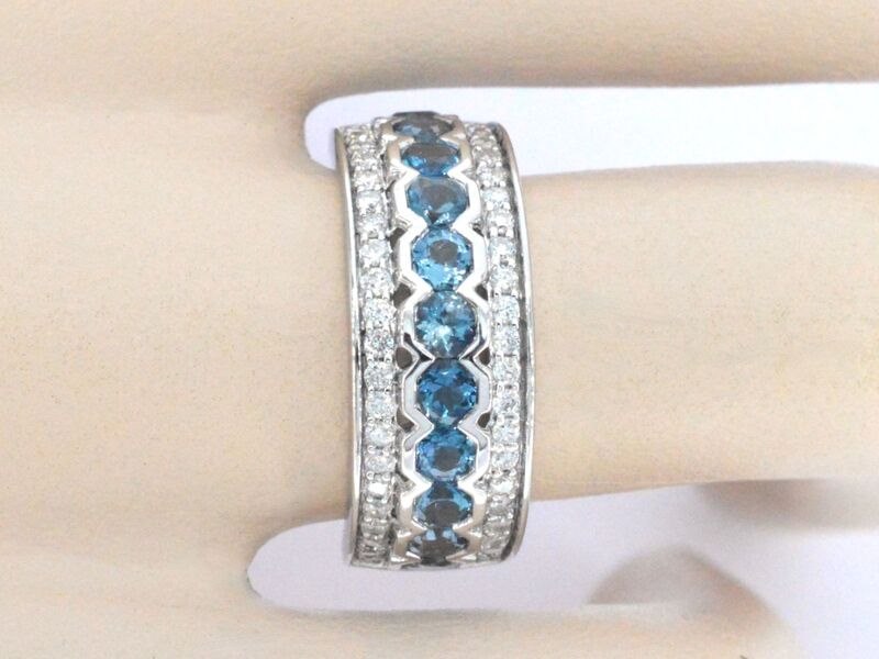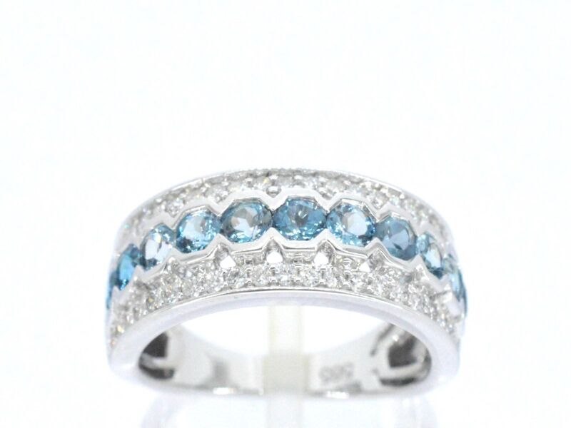 Product: Witgouden pave ring met diamanten en topaas Specificaties: Diamant: Natuurlijk Slijpvorm: Briljant geslepen Gewicht (carat): 0.50 carat Kleur: F-G Zuiverheid: SI-P Slijpkwaliteit: Zeer mooi Edelsteen: Topaas Slijpvorm: rond Gewicht (carat): 1.50 carat Kleur: London blue Juweel: Ring Gewicht: 5.5 gram Ringmaat (op maat gemaakt*): 54 (17.25 mm) Materiaal: 14 karaat (585) Conditie: Nieuw Verpakking: Luxe sieradendoos Toelichting: De kwaliteit is overgenomen van het rapport behorend bij item. De waardebepaling is een beoordeling van een gecertificeerde diamantair, gebaseerd op consumentenprijzen. Consumentenprijs: € 3.920,- *Ring kan als het mogelijk is op maat gemaakt worden.