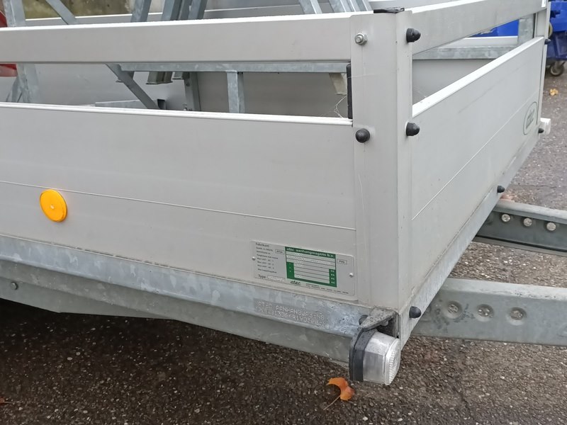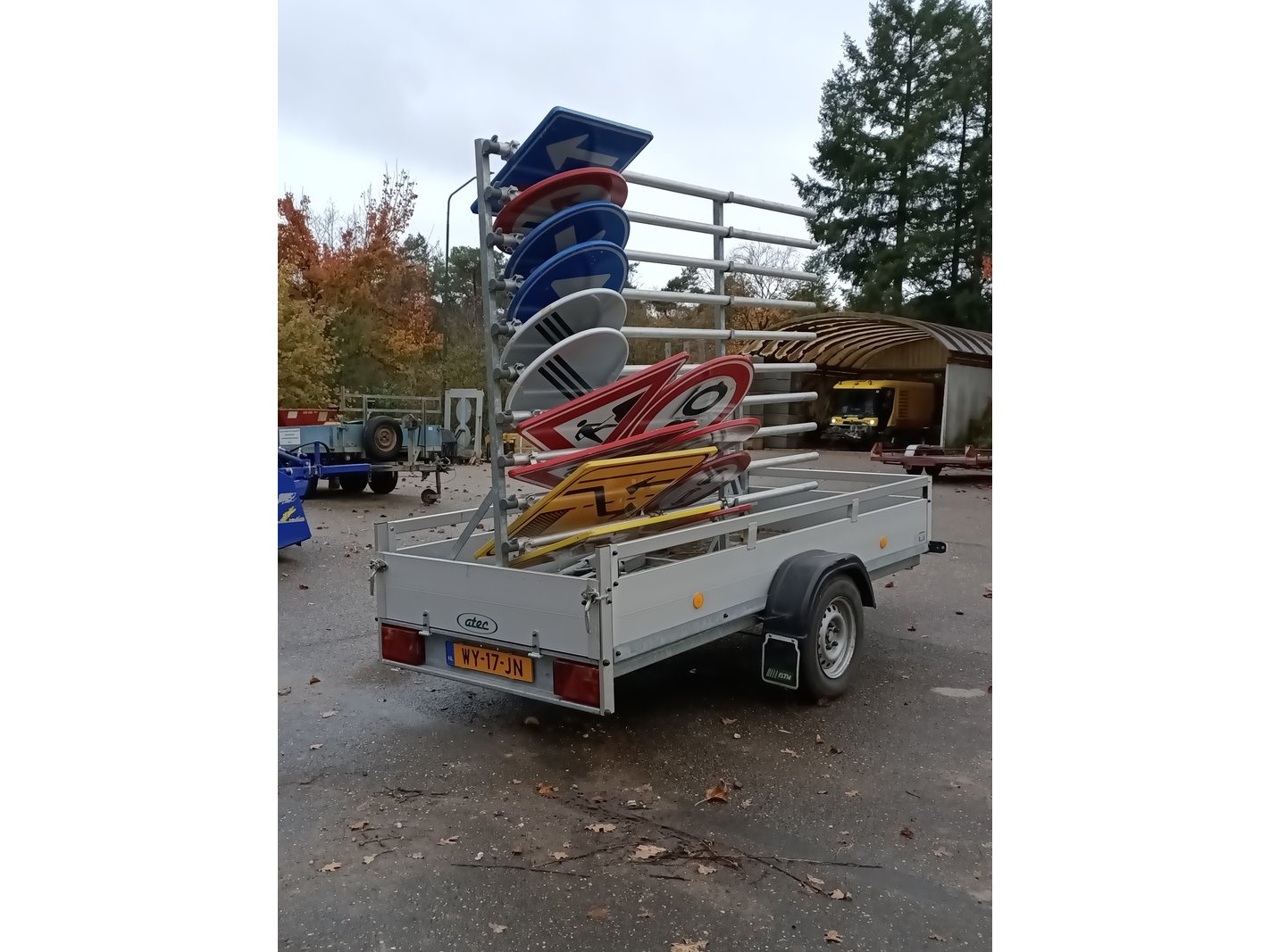 Merk: Atec Product: Verkeersborden aanhanger Afmeting: afmeting bakmaat ca. 300x130 cm Conditie: Gebruikt Specificaties: Kenteken WY-17-JN Datum eerst toelating: 13 april 2000 Massa rijklaar: 320 kg Laadvermogen: 980 kg Inclusief diverse verkeersborden.