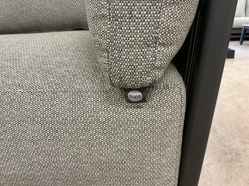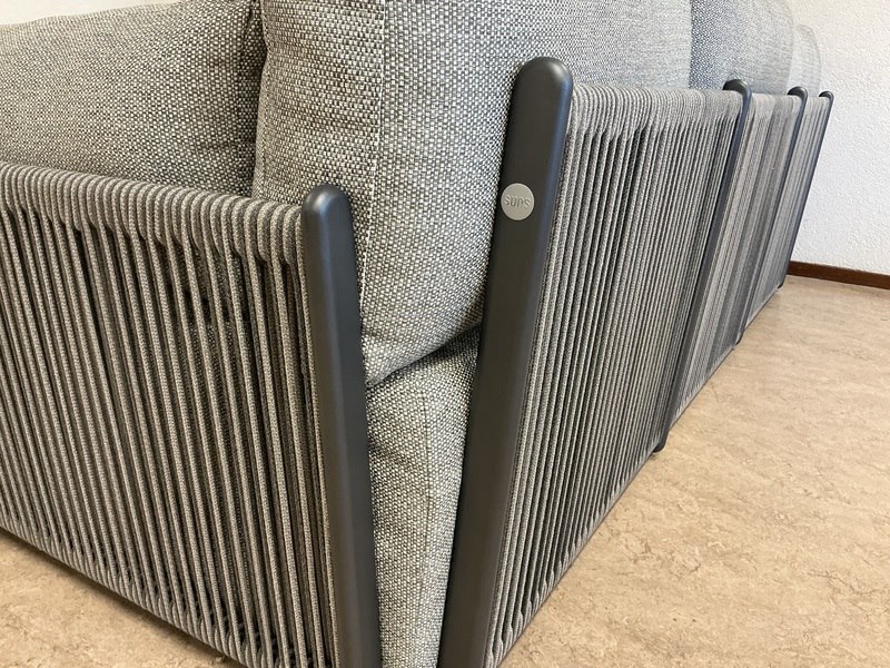 Merk: Suns Product: Lounge-set Kleur: MRG Camel sand Materiaal: Aluminium, teak met touwwerk Afmeting: 355x265cm Conditie: nieuw Specificaties: Tafel 58x44cm, tafel 91x34 cm