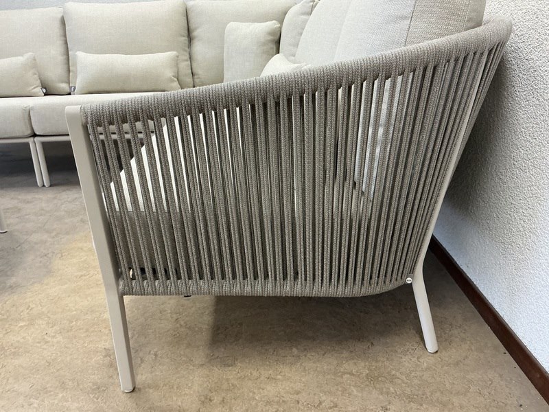 Merk: Suns Product: Lounge-set Kleur: Camel sand/ nw Materiaal: Aluminium, teak met touwwerk Conditie: nieuw Specificaties: 2 zits rechts; midde stuk; 2 zits links; tafel Ø 91 cm