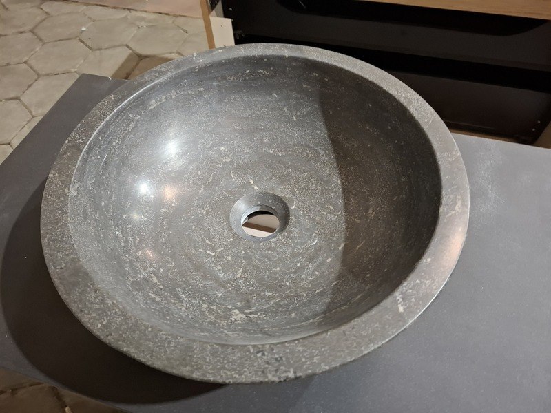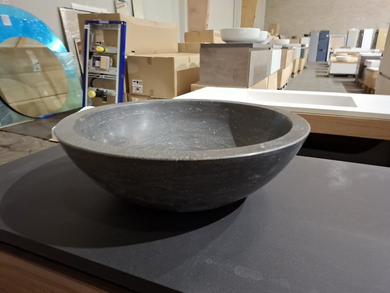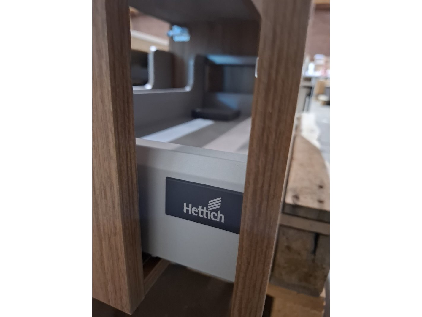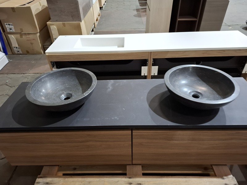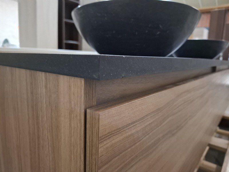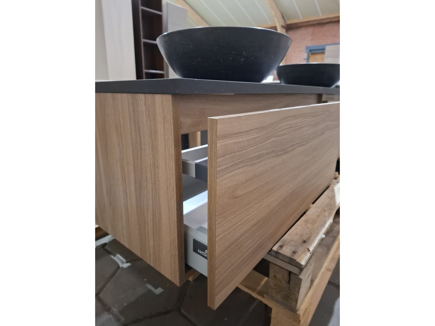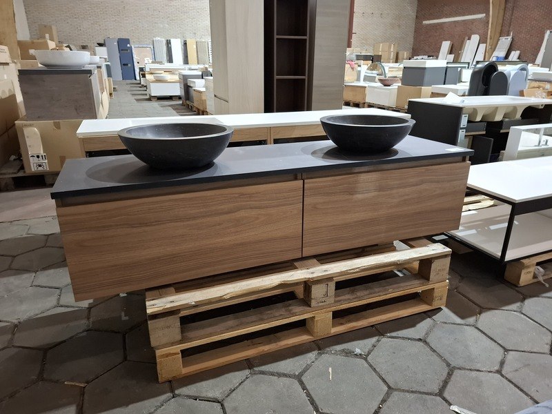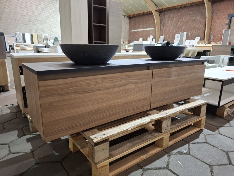 Merk: Imtech Product: Badmeubel Kleur: noten Afmeting: 160x45cm Specificaties: 2 lades met softclose, hardstenen topblad, mat zwart, 2x waskom, hardsteen, gezoet, antraciet