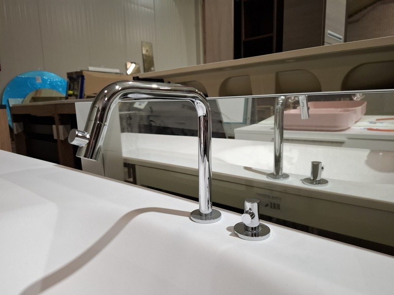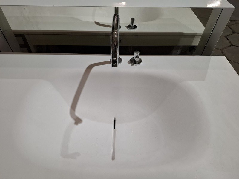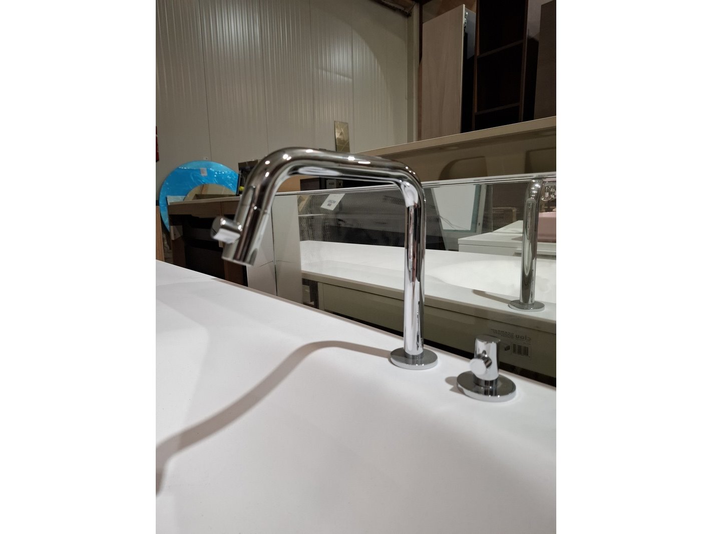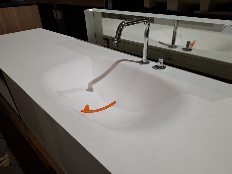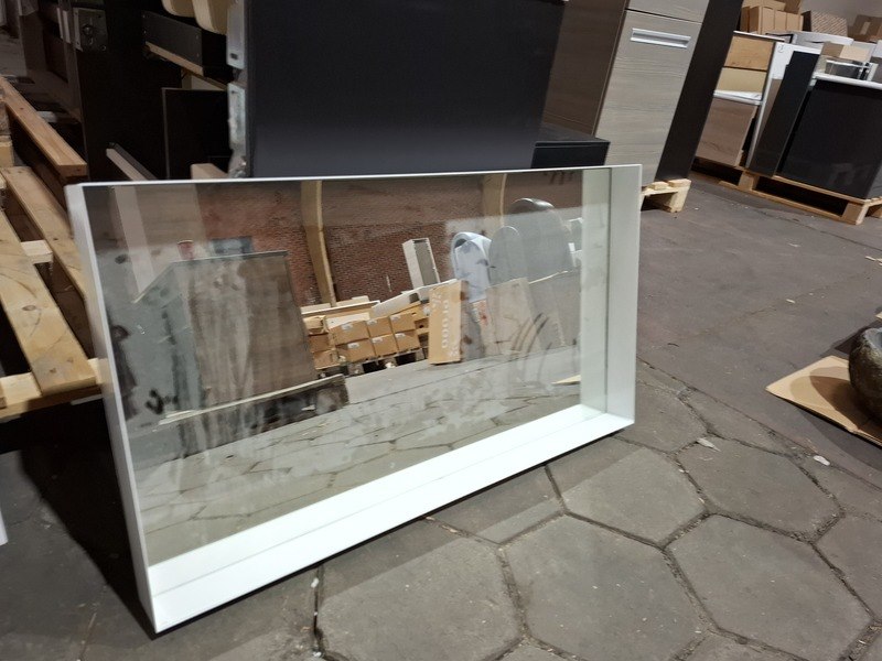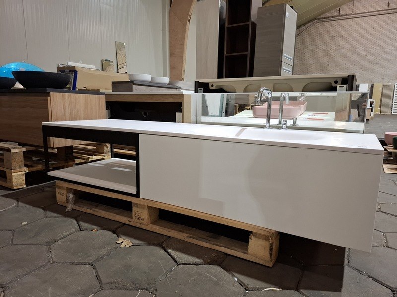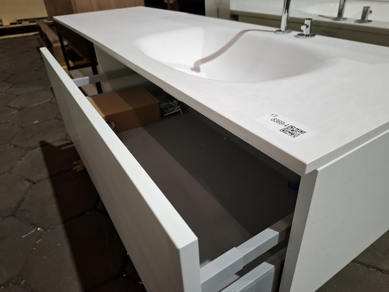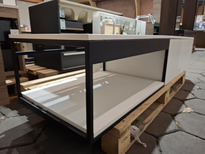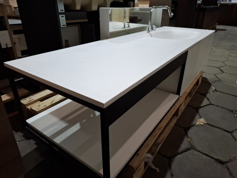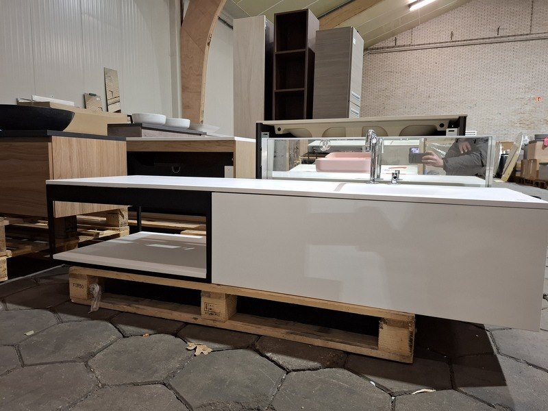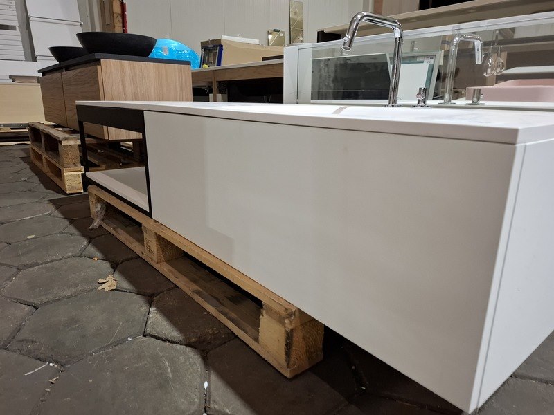 Merk: Clou Product: Badmeubel Kleur: mat wit Afmeting: 160x50cm Specificaties: 1 lade met softclose, solid surface wastafel, mat wit, bak rechts, incl. wastafelkraan, chroom, regaalframe mat zwart, spiegel met wit kader