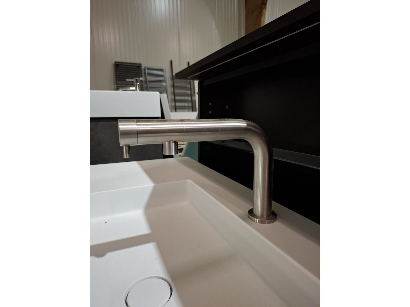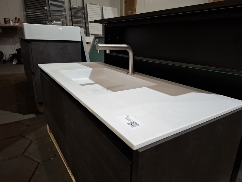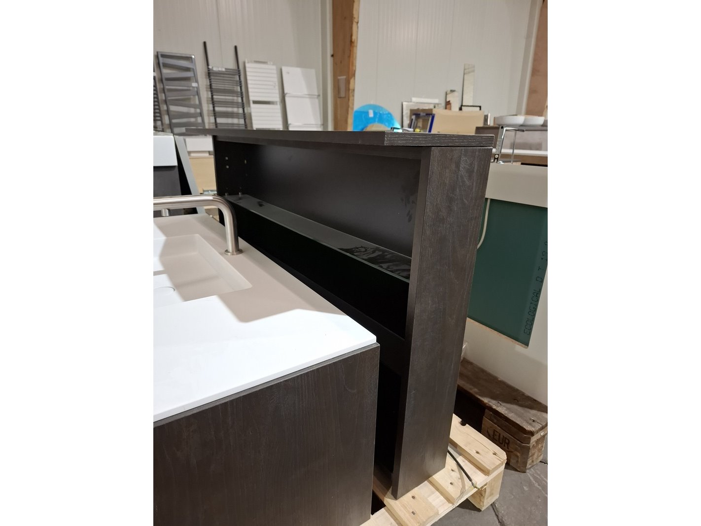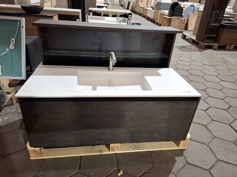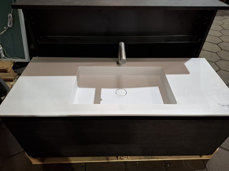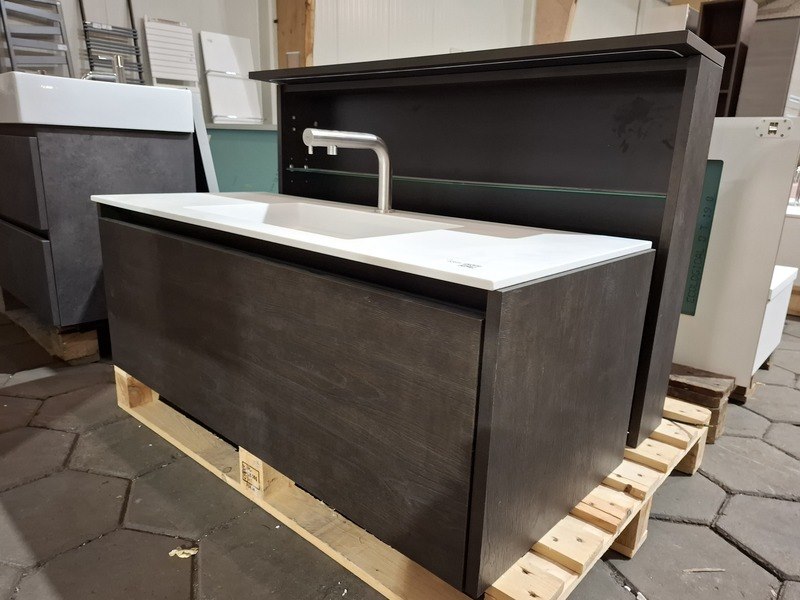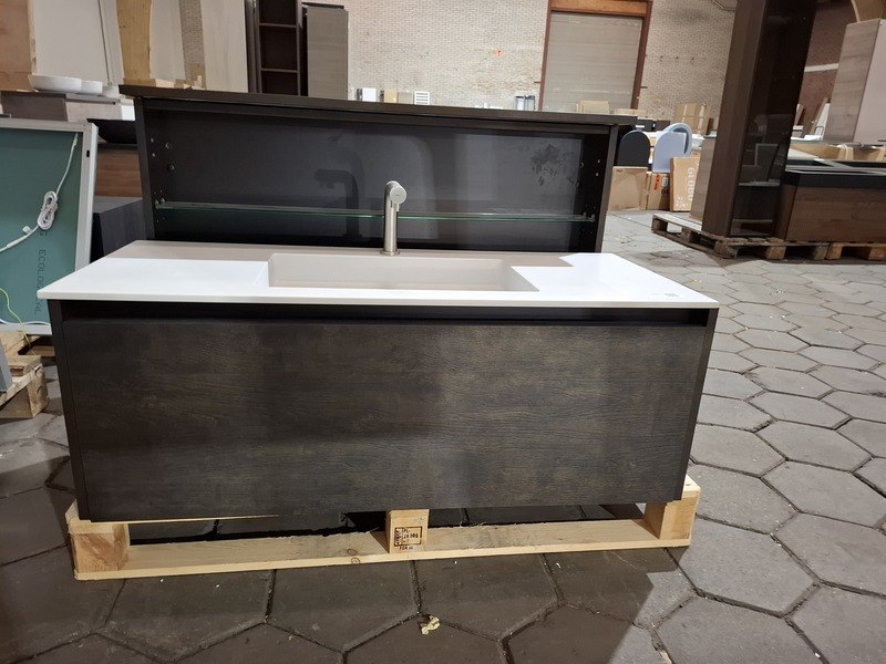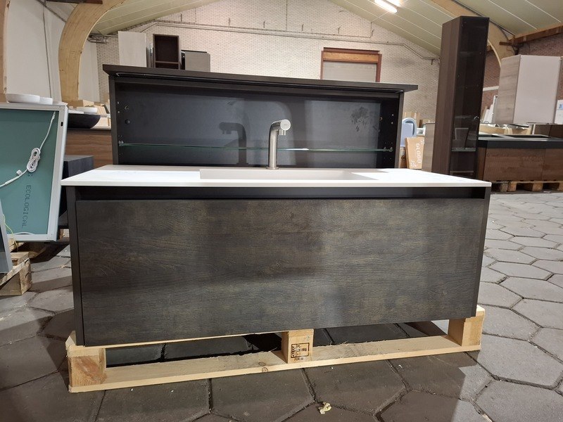 Merk: Elise Product: Badmeubel Kleur: hout Afmeting: 110x46cm Specificaties: 1 lade met softclose, solid surface wastafel, mat wit, wastafelkraan, rvs geborsteld, open spiegelkast, met LED verlichting, met stopcontact, glazen leggers