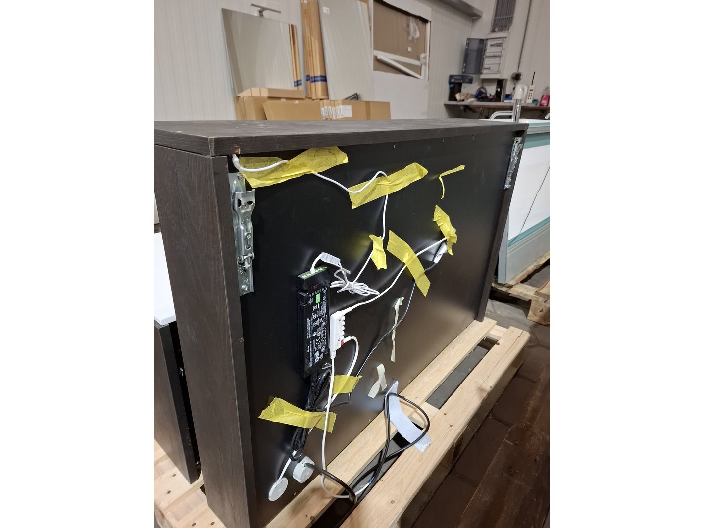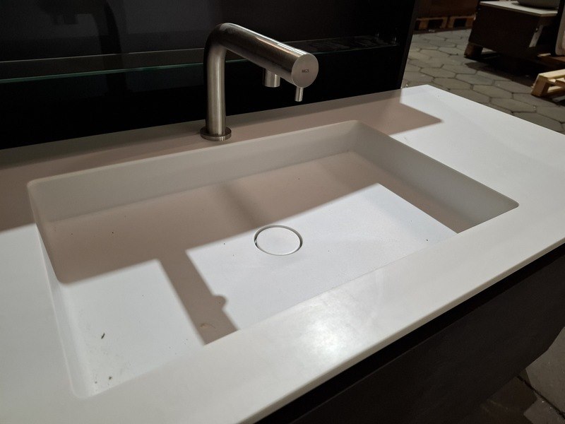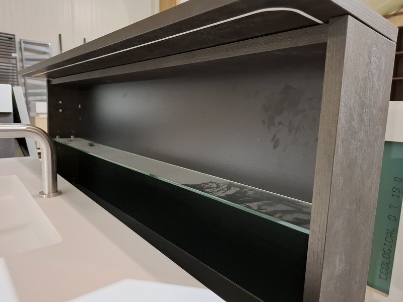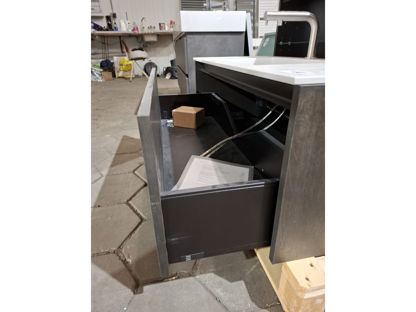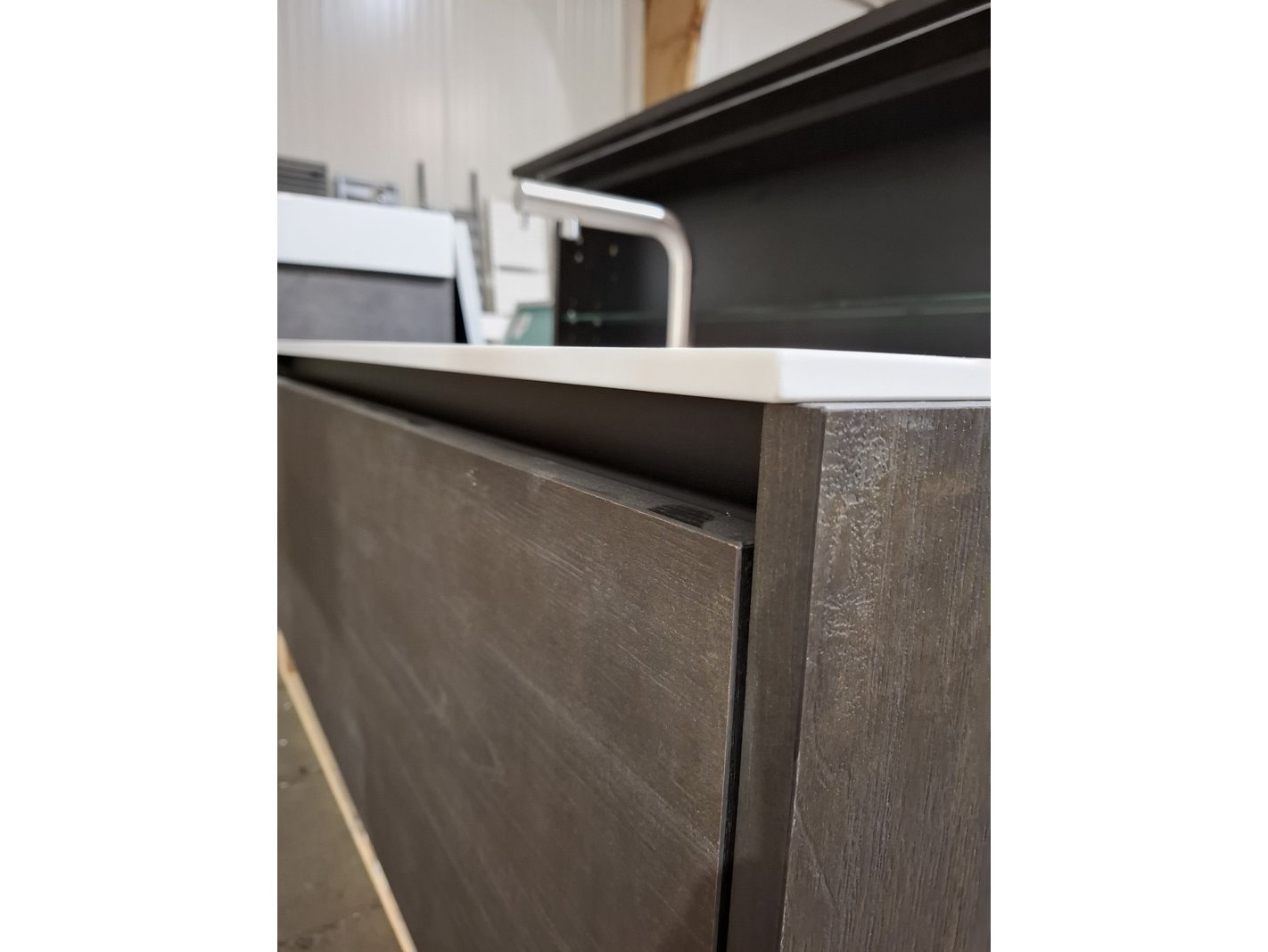 Merk: Elise Product: Badmeubel Kleur: hout Afmeting: 110x46cm Specificaties: 1 lade met softclose, solid surface wastafel, mat wit, wastafelkraan, rvs geborsteld, open spiegelkast, met LED verlichting, met stopcontact, glazen leggers