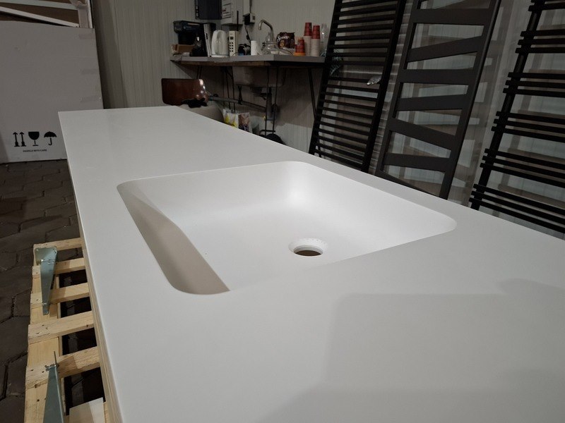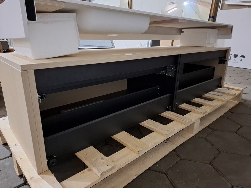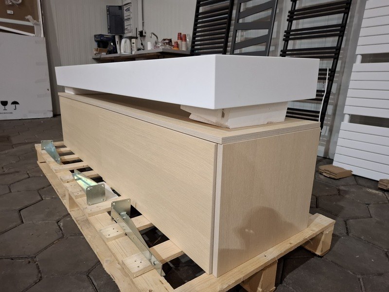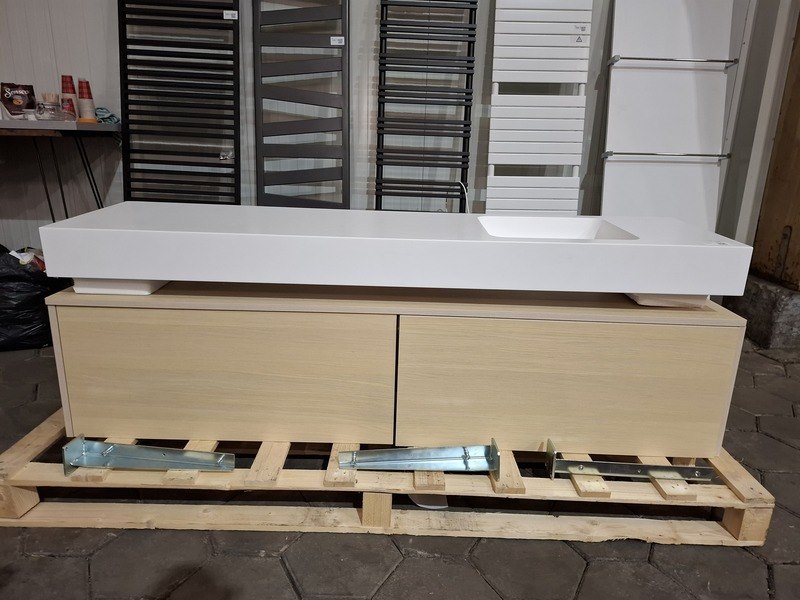 Merk: Primabad Product: Badmeubel Kleur: eiken Afmeting: 180x46cm Specificaties: 2 lades met softclose, solid surface wastafel, 1 bak, rechts, mat wit