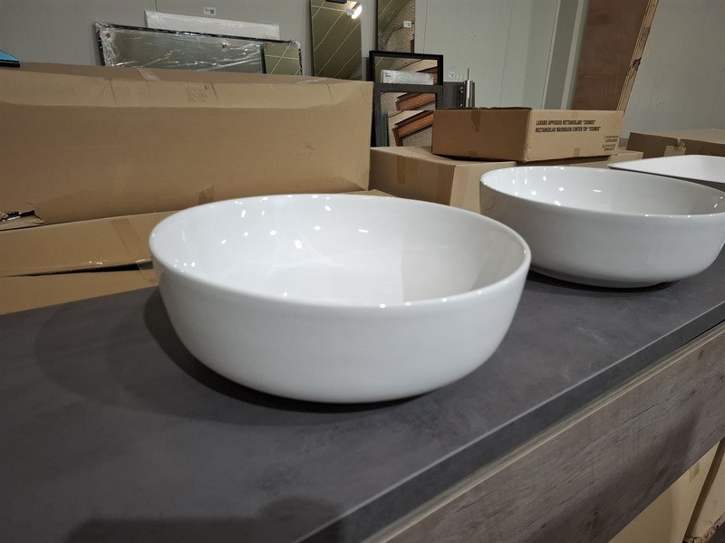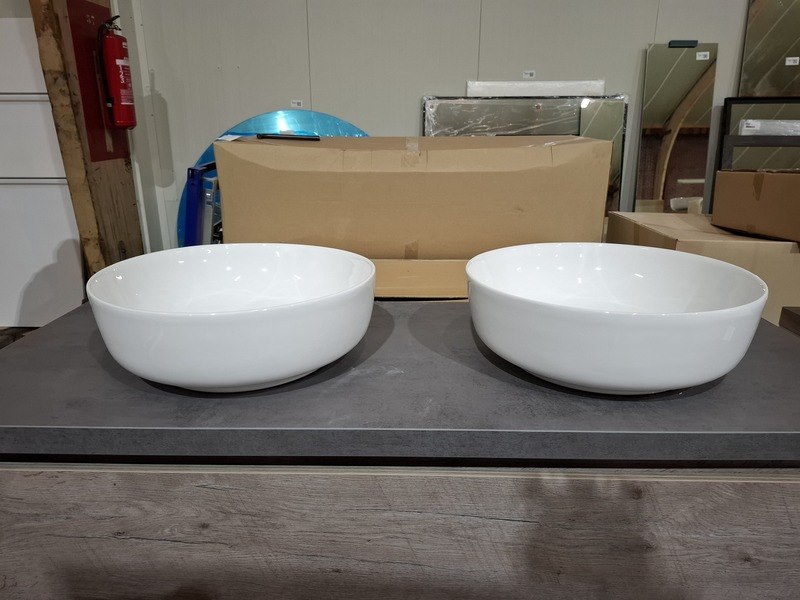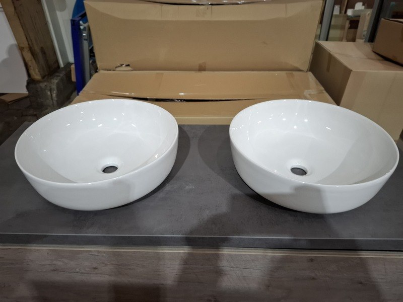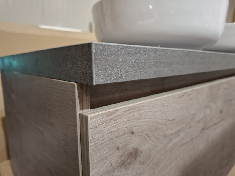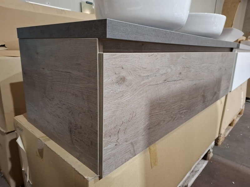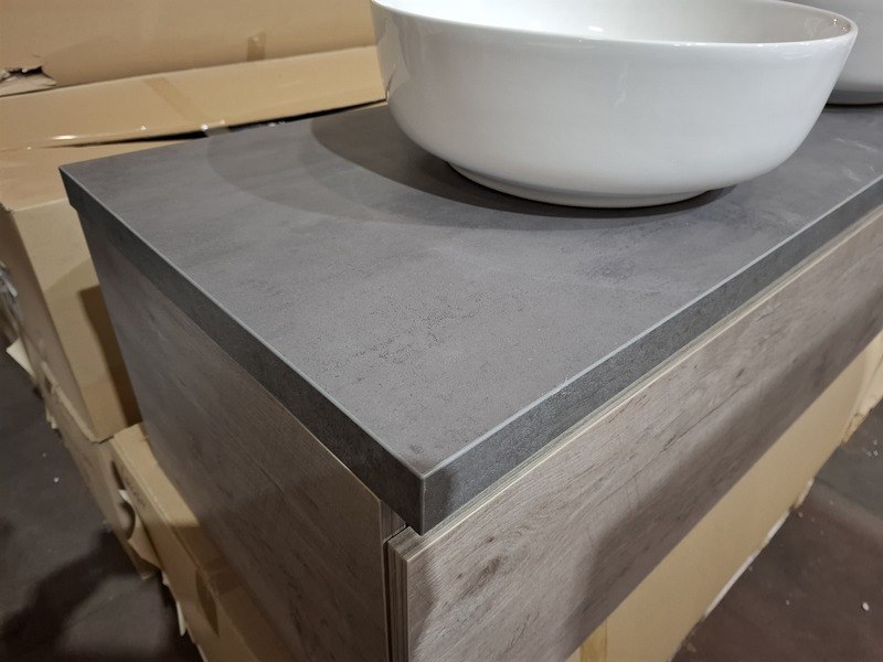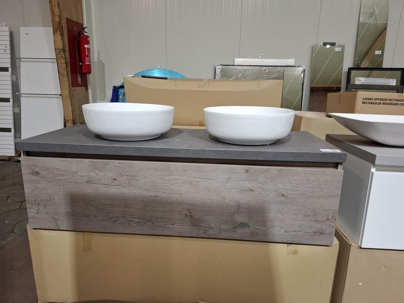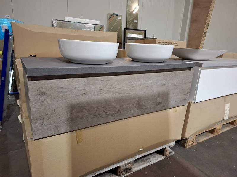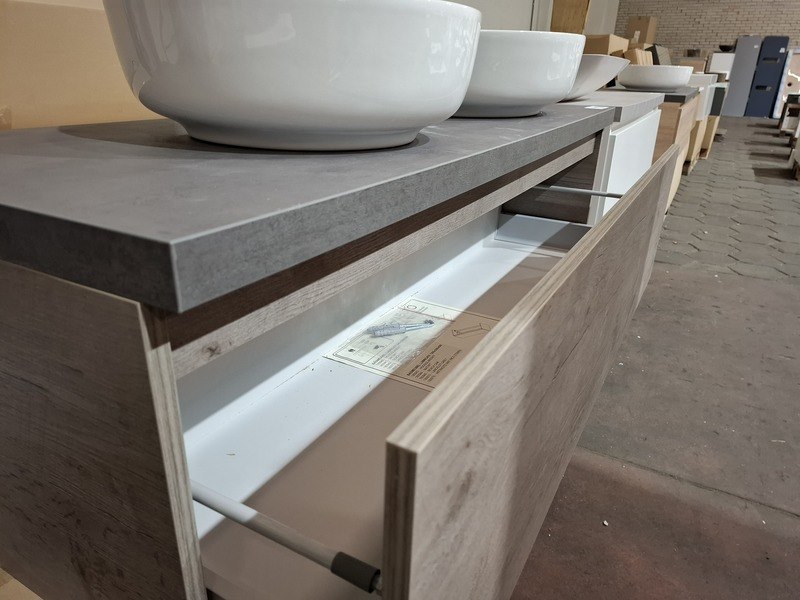 Product: Badmeubel Kleur: grijs Afmeting: 130x50cm Specificaties: 1 lade met softclose, met Blum geleidesysteem, topblad, antraciet, 2x waskom keramisch, wit