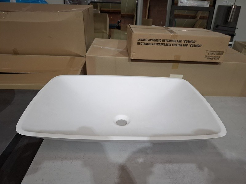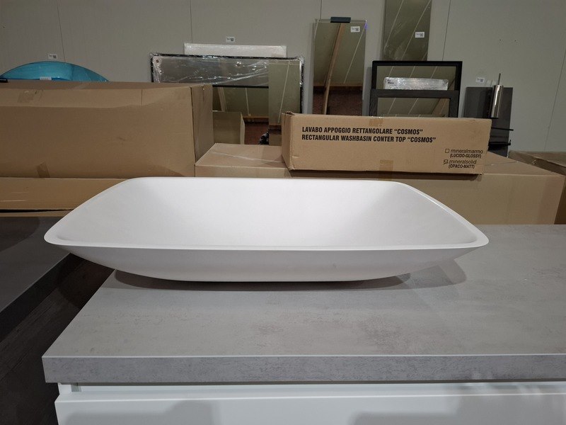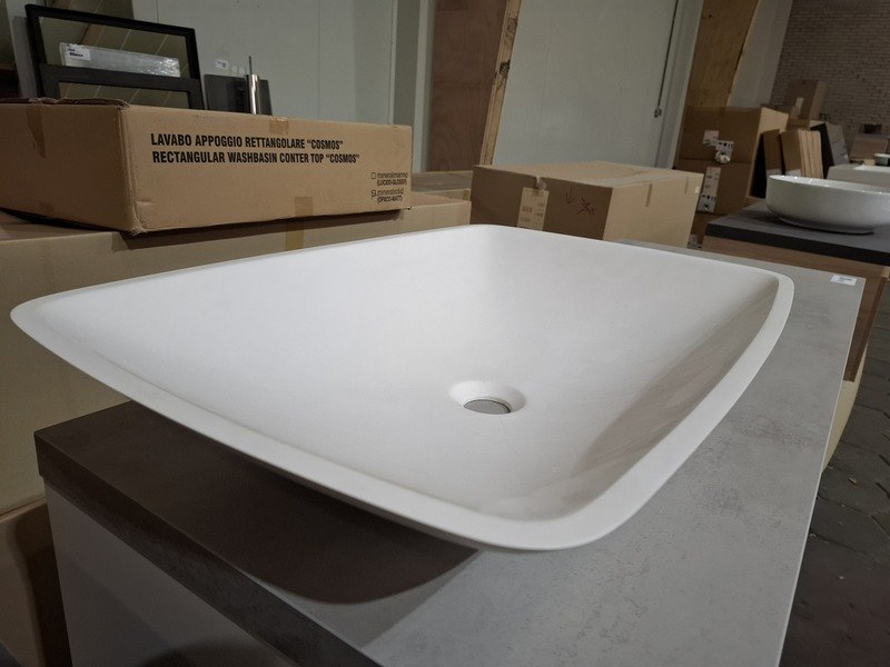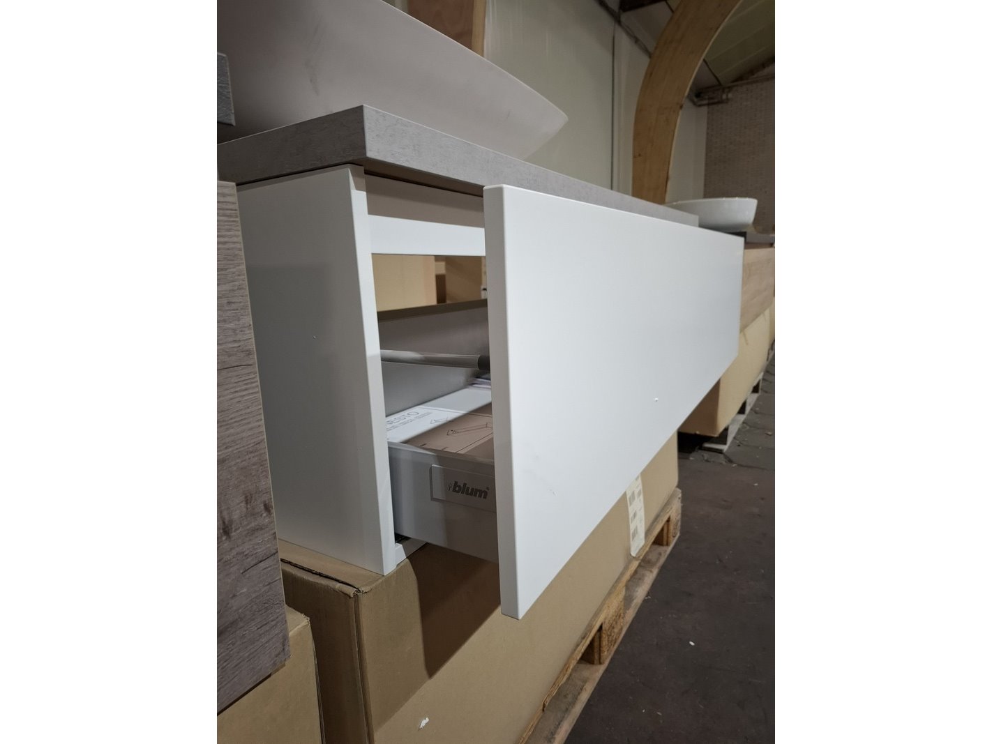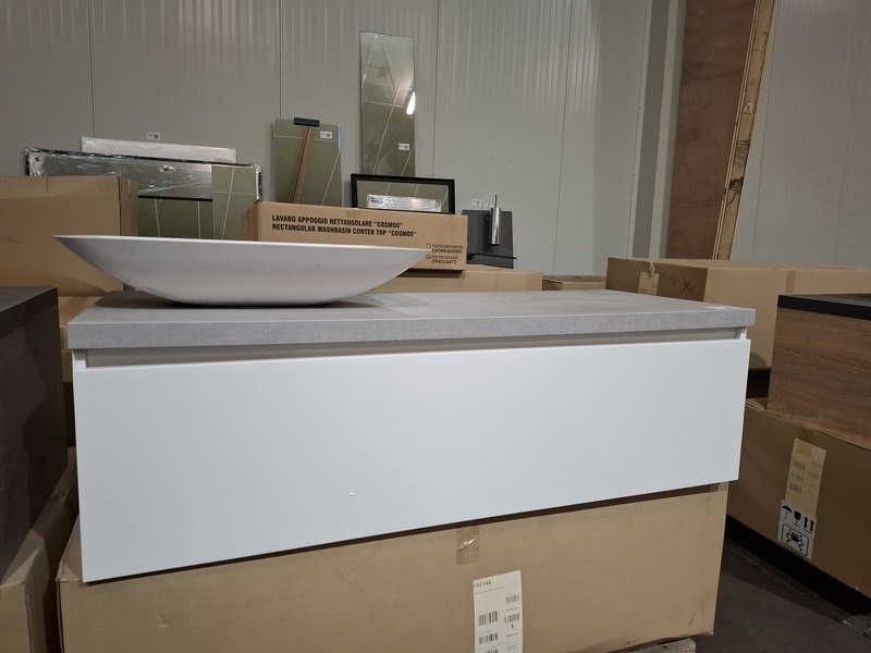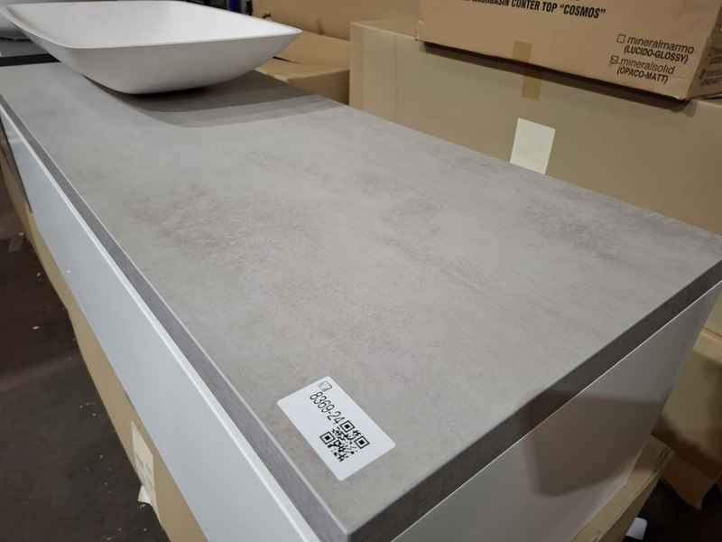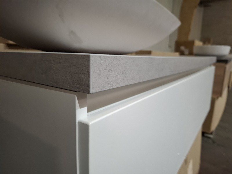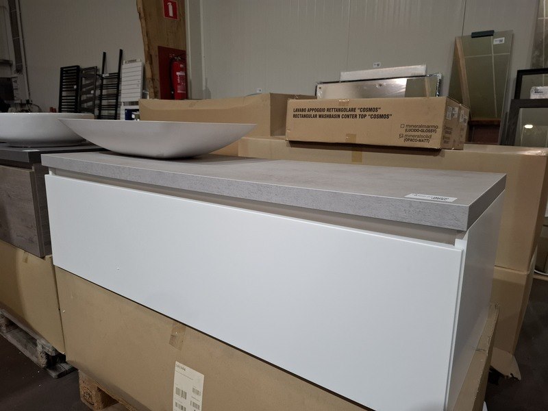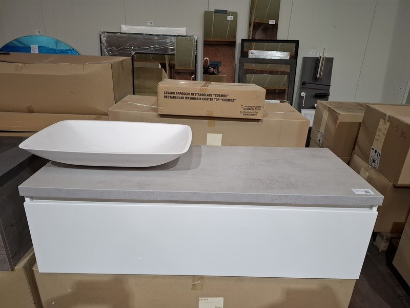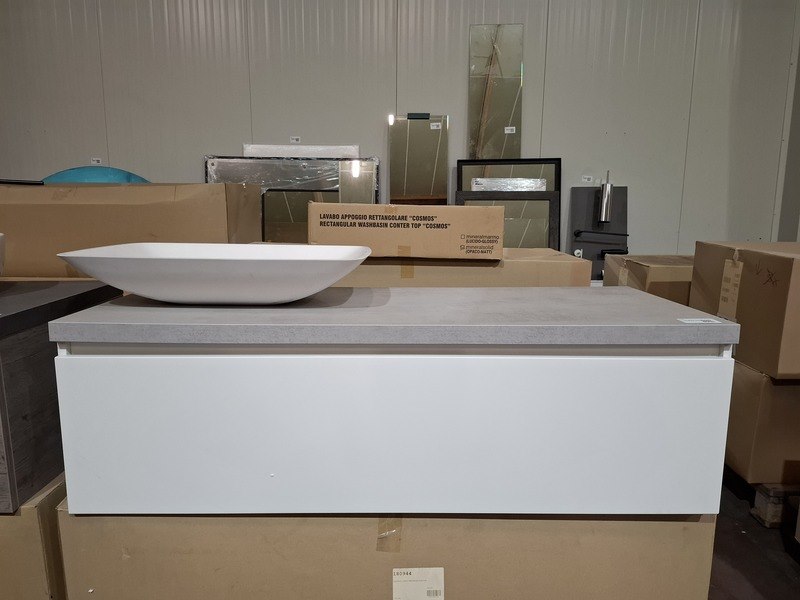 Product: Badmeubel Kleur: mat wit Afmeting: 130x50cm Specificaties: 1 lade met softclose, met Blum geleidesysteem, topblad, beton grijs, 1x waskom solid surface, mat wit