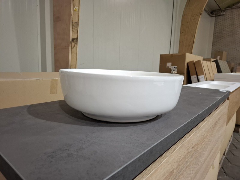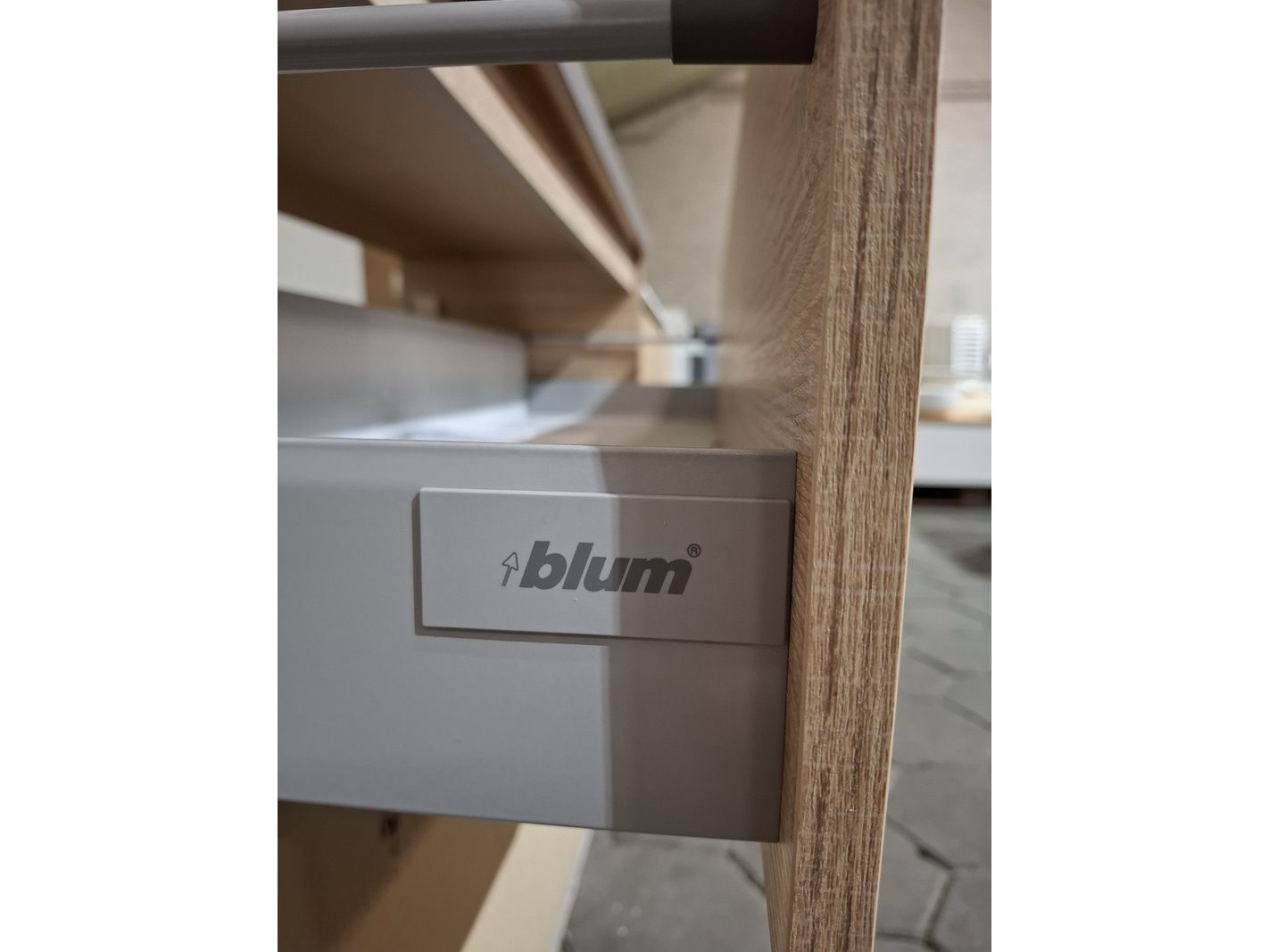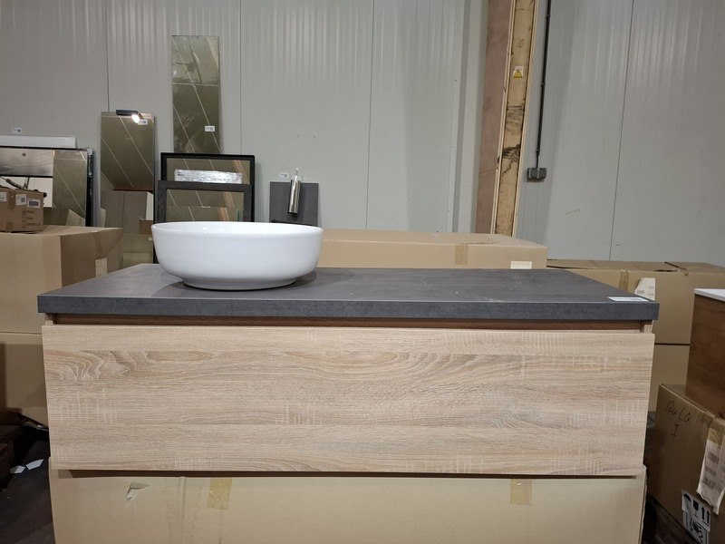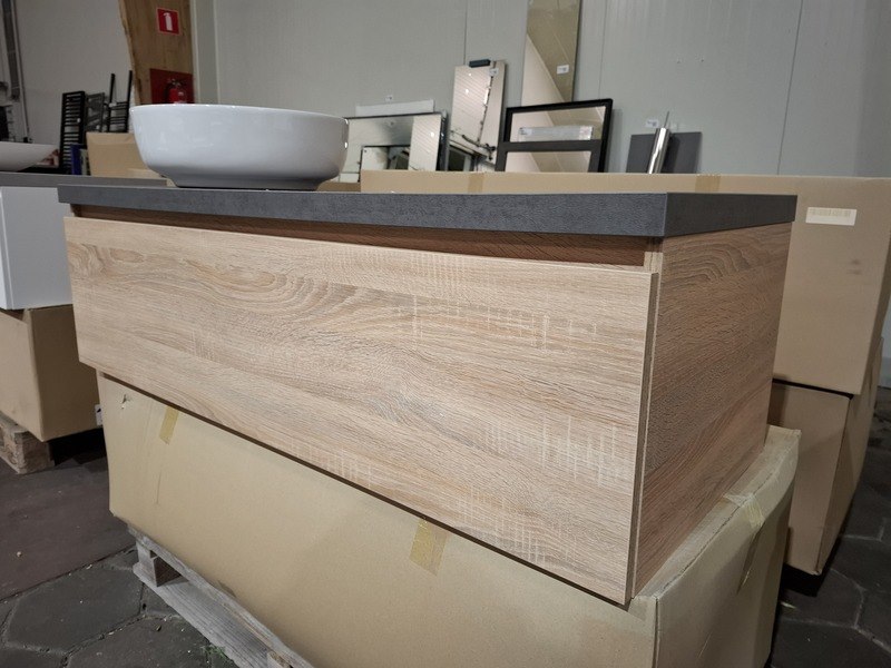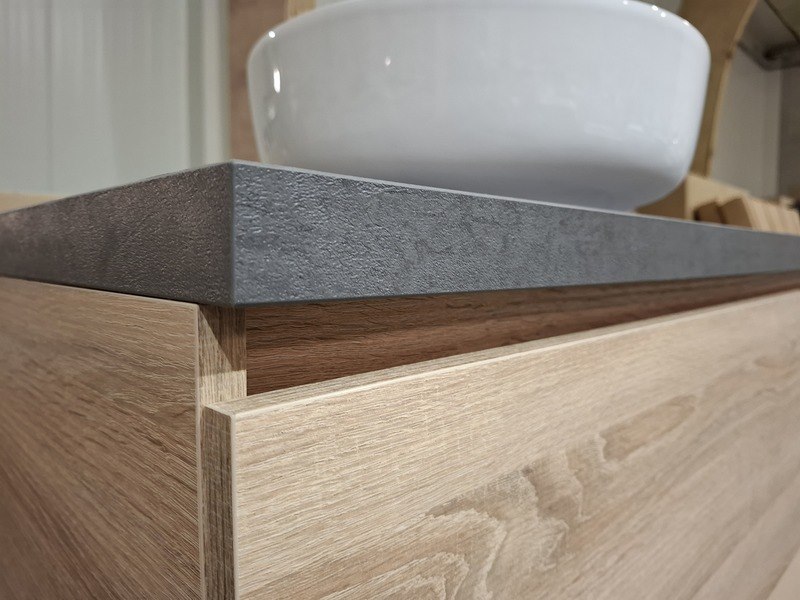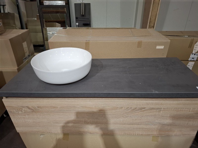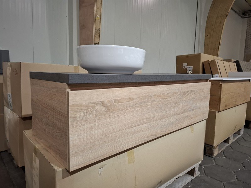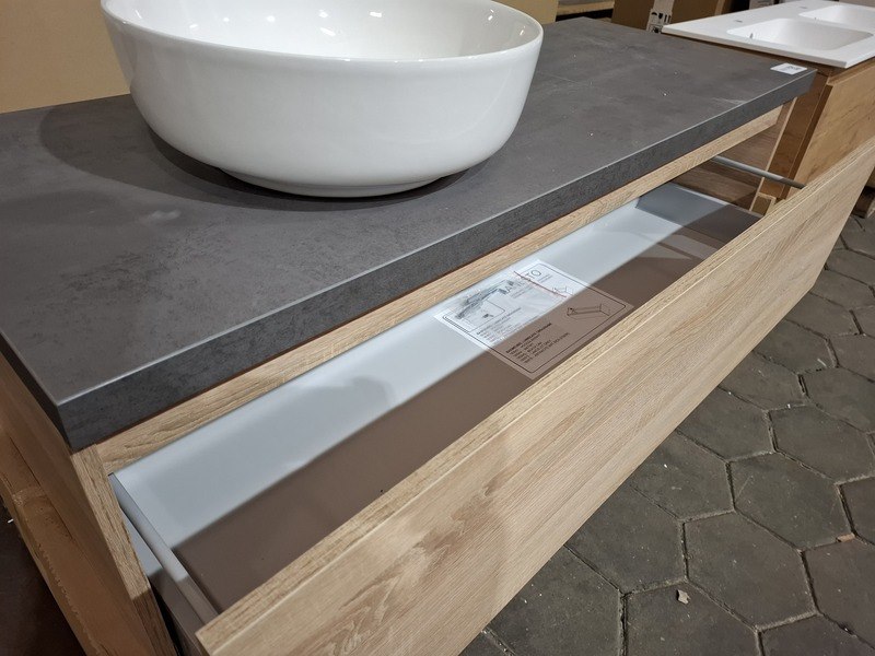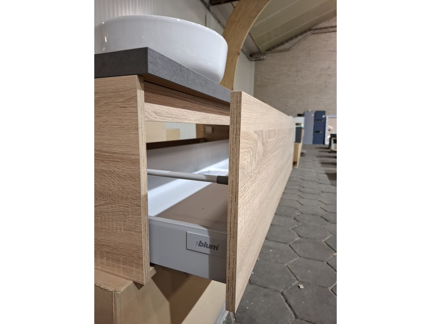 Product: Badmeubel met waskom Kleur: Eiken Afmeting: 130x50cm Specificaties: 1 lade met softclose, met Blum geleidesysteem, topblad, antraciet, 1x waskom keramisch, wit