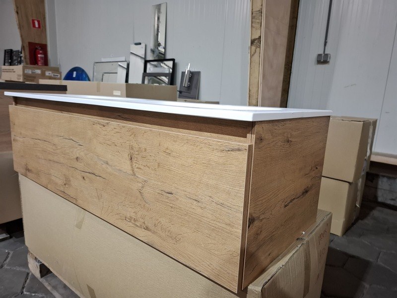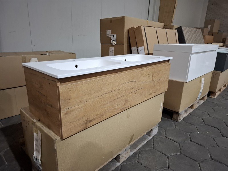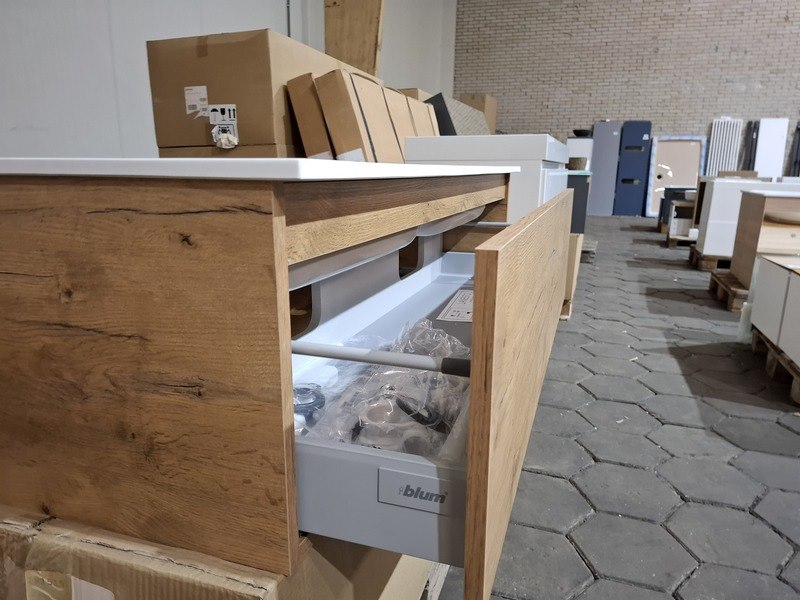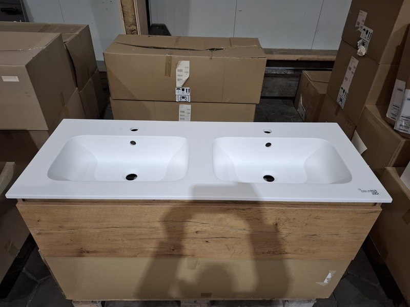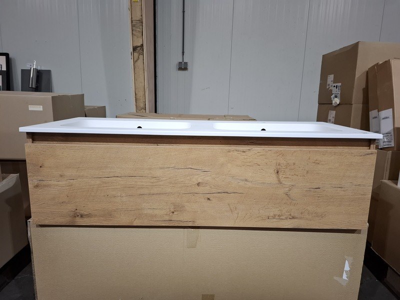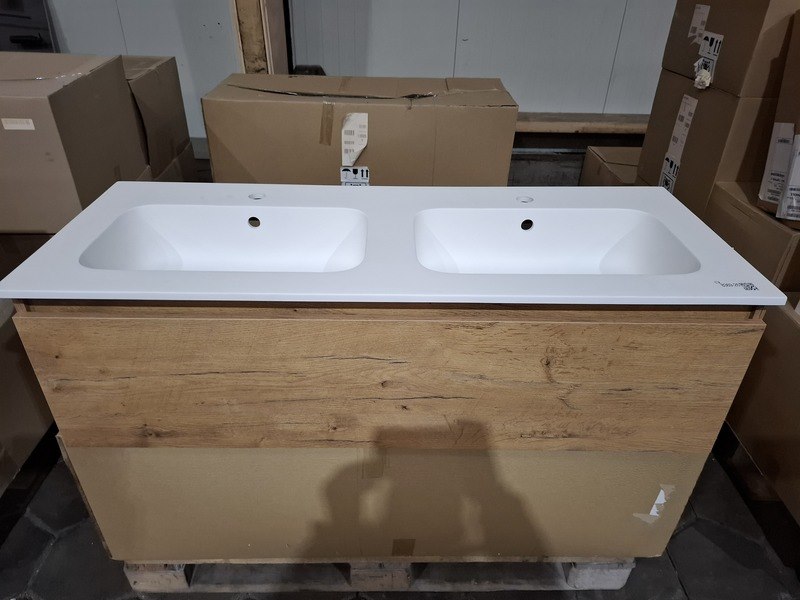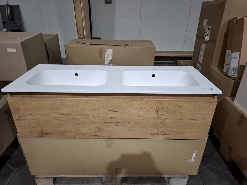 Product: Badmeubel Kleur: Lancelot eiken Afmeting: 120x46cm Specificaties: 1 lade met softclose, met Blum geleidesysteem, polybeton wastafel, mat wit, 2 bakken, 2 kraangaten
