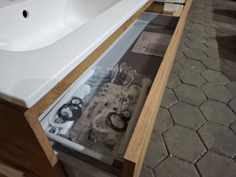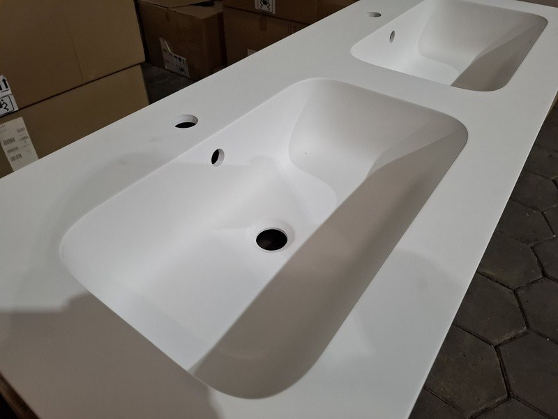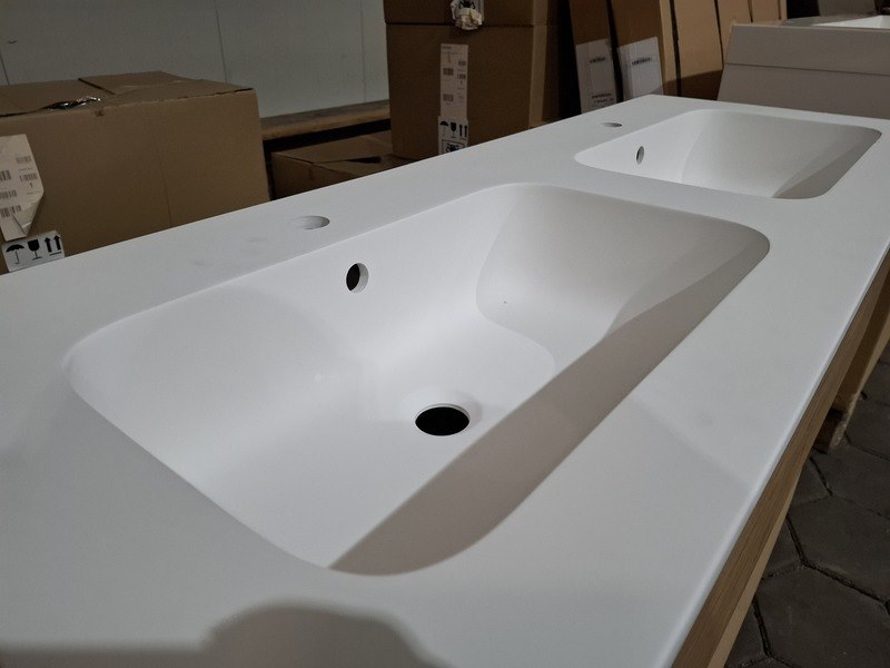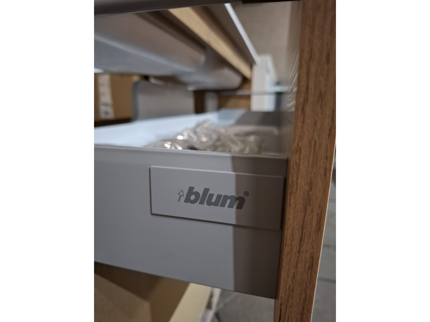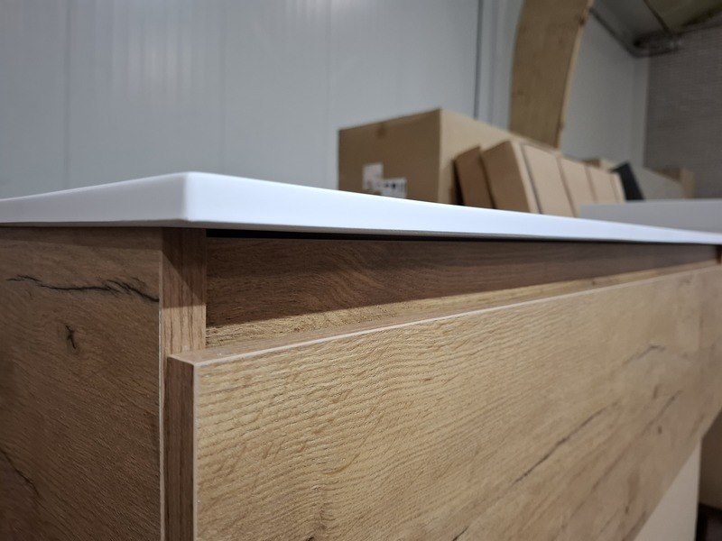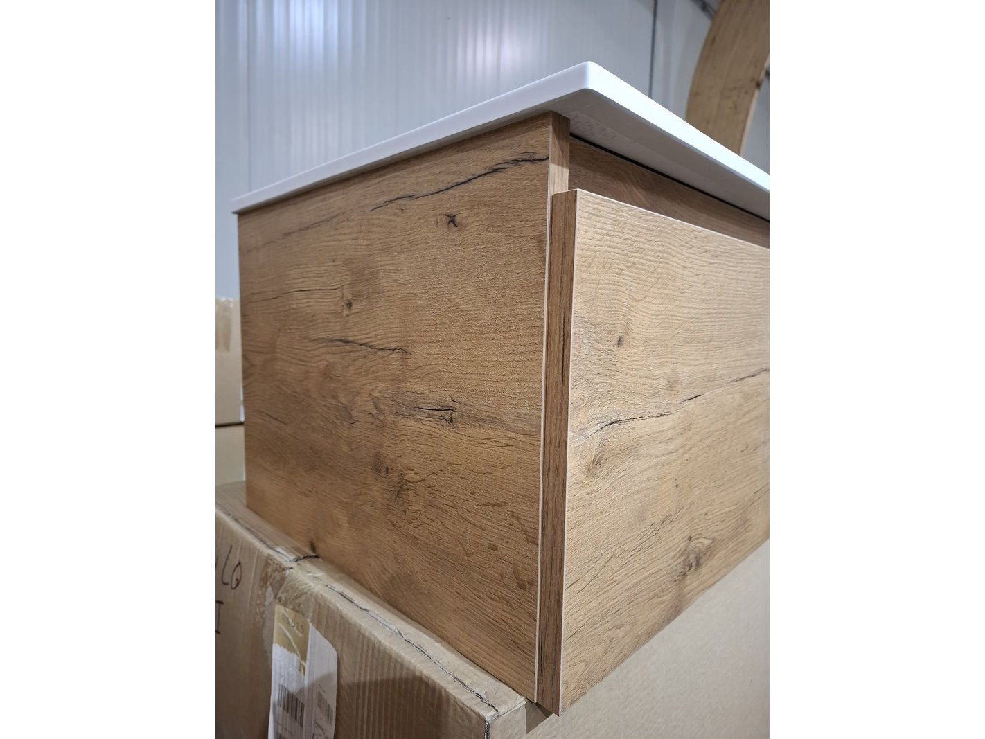 Product: Badmeubel Kleur: Lancelot eiken Afmeting: 120x46cm Specificaties: 1 lade met softclose, met Blum geleidesysteem, polybeton wastafel, mat wit, 2 bakken, 2 kraangaten