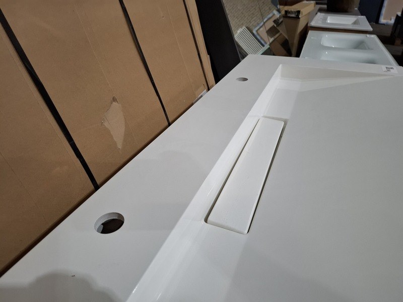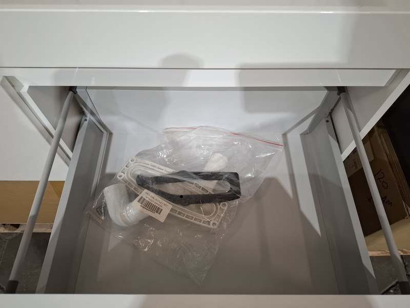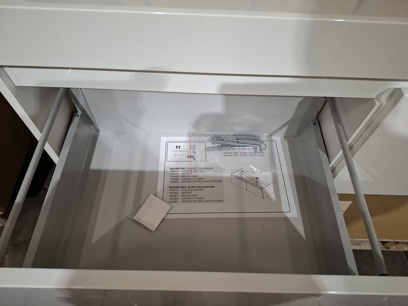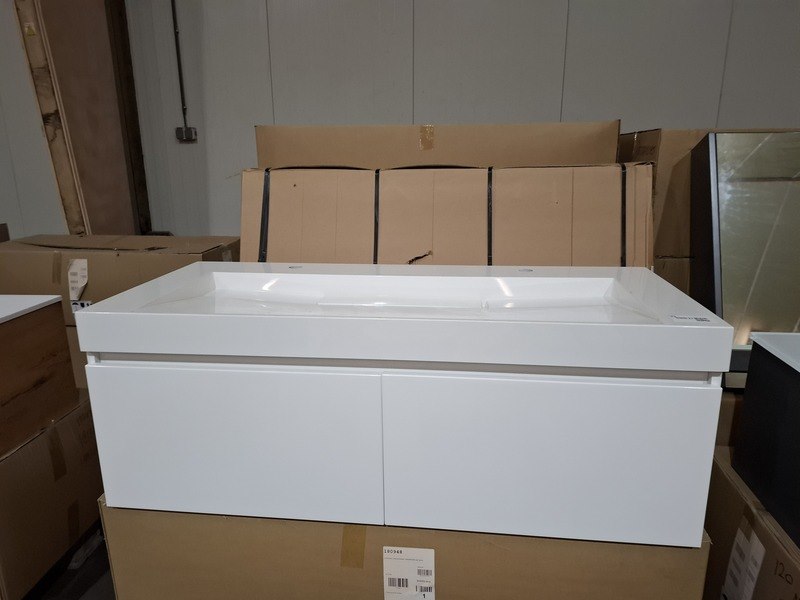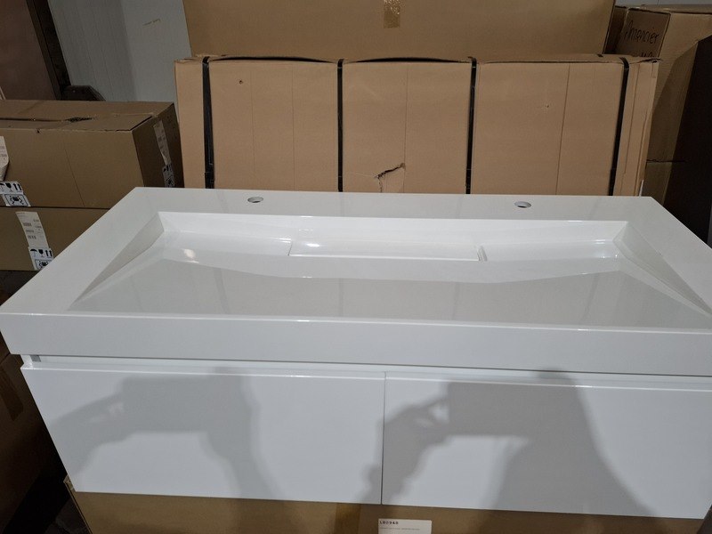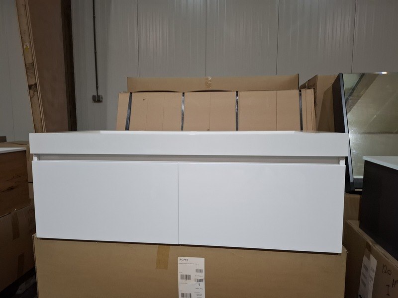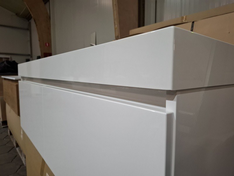 Product: Badmeubel Kleur: glans wit Afmeting: 120x50cm Specificaties: 2 lades met softclose, Blum geleidesysteem, polybeton wastafel, glans wit, verdekte afvoer