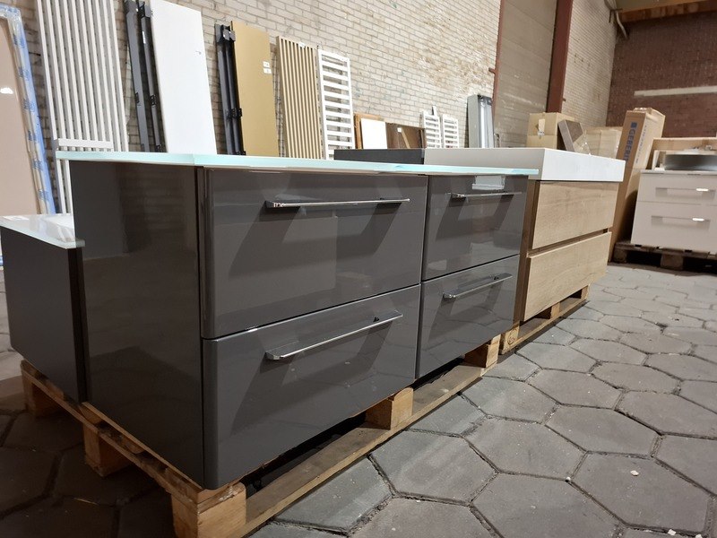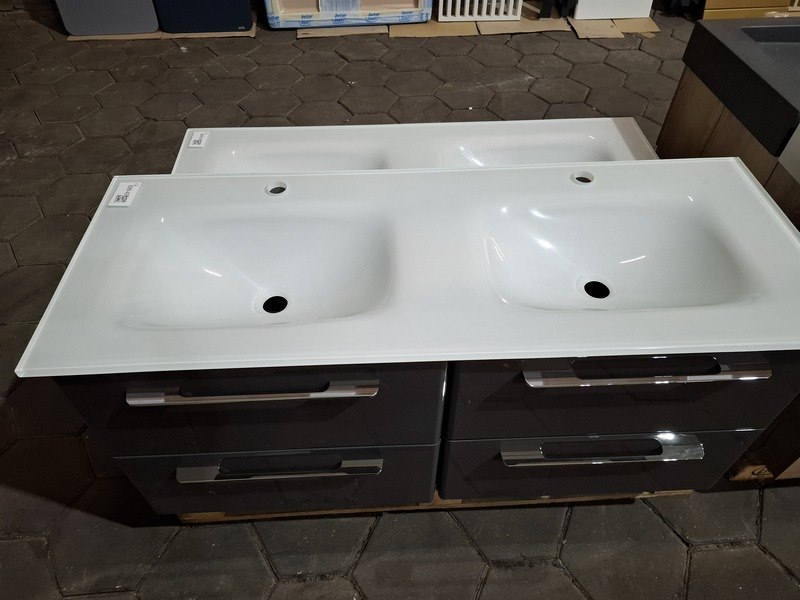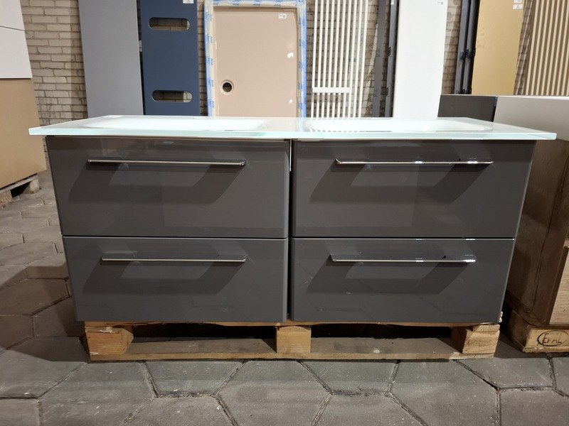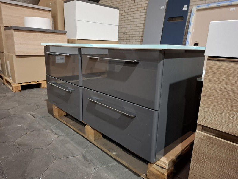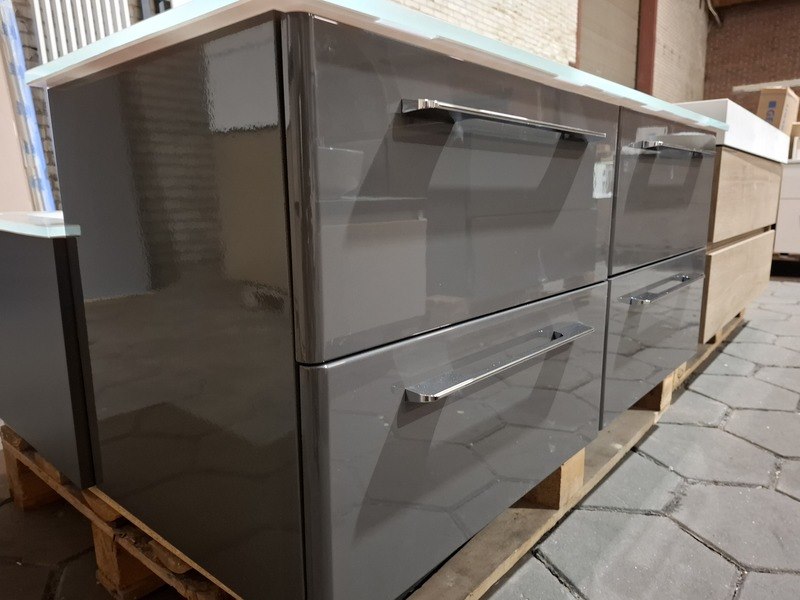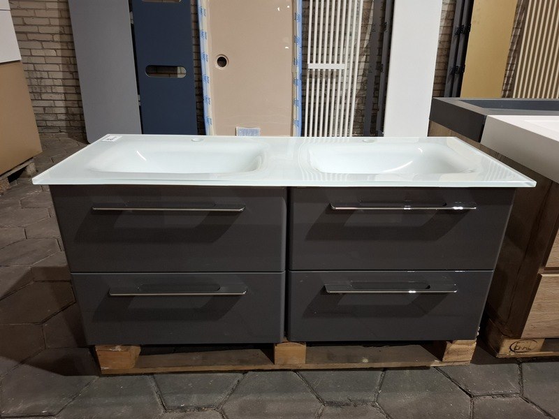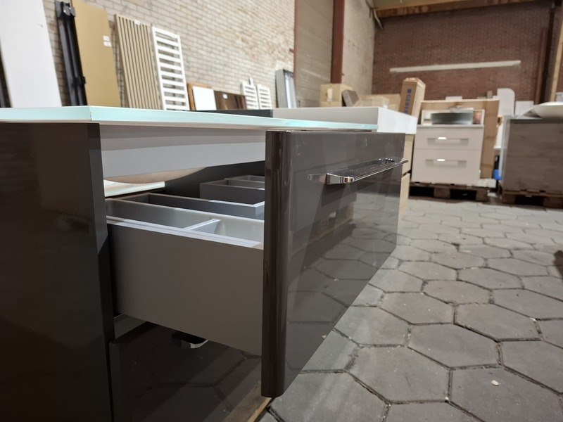 Product: Badmeubel Kleur: glans antraciet Afmeting: 120x46cm Specificaties: 4 lades met softclose, chromen grepen, glazen wastafel, mat wit rookglas
