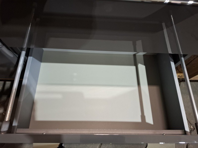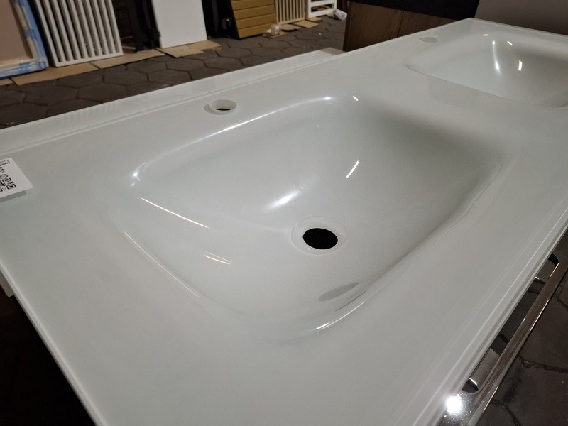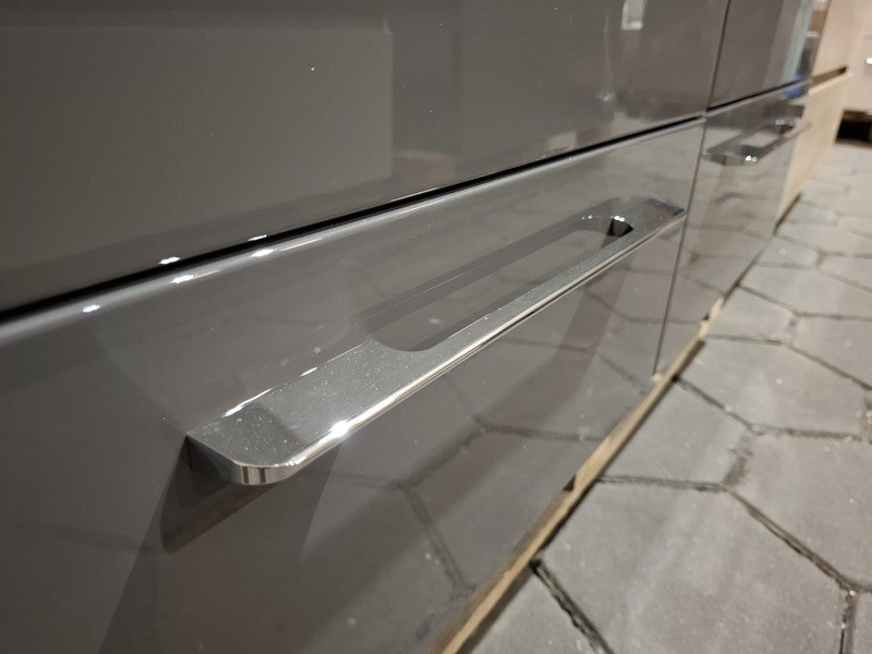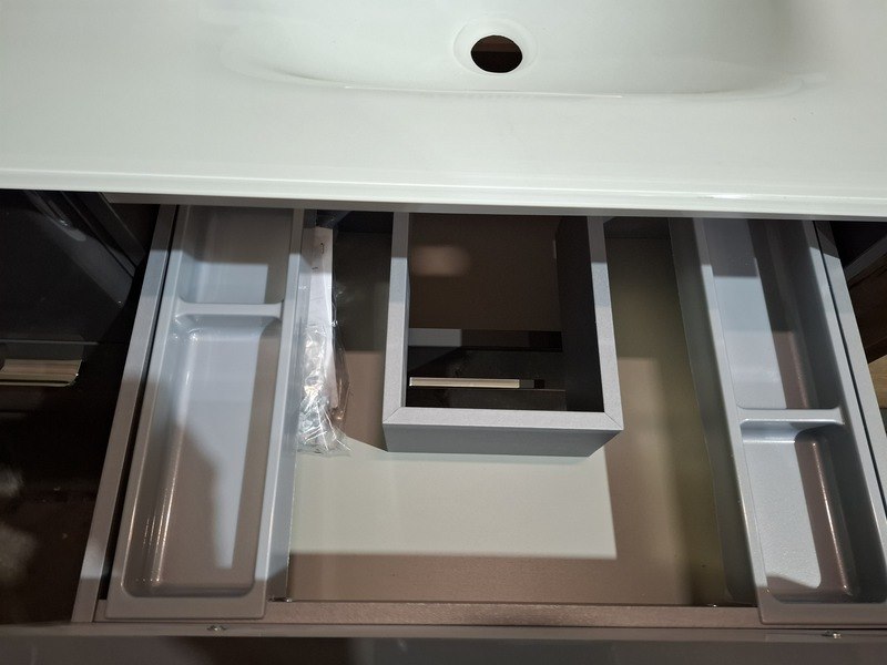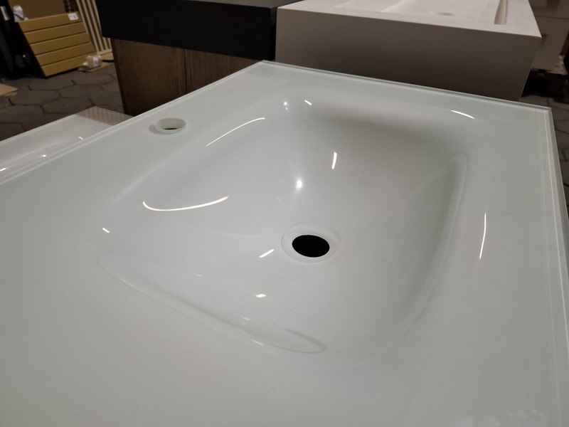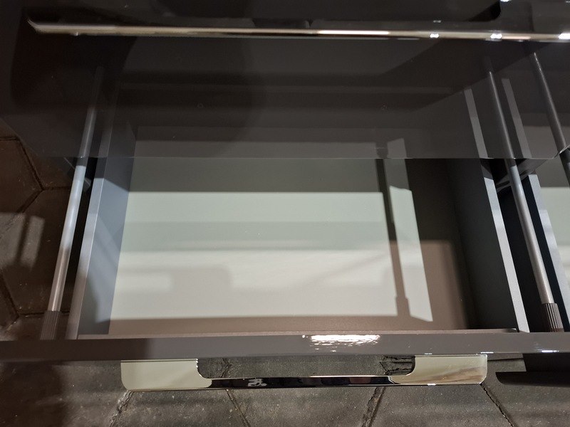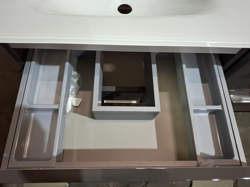 Product: Badmeubel Kleur: glans antraciet Afmeting: 120x46cm Specificaties: 4 lades met softclose, chromen grepen, glazen wastafel, mat wit rookglas