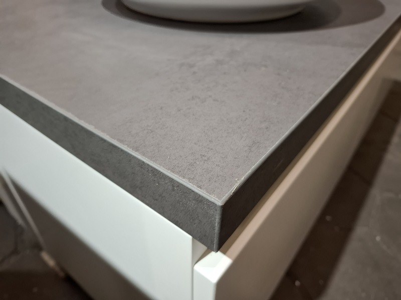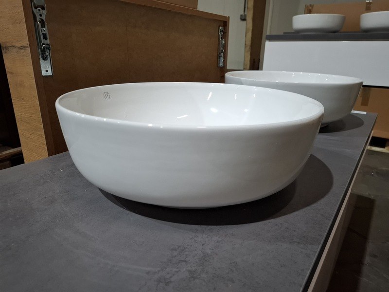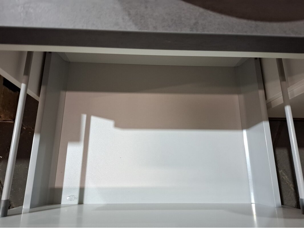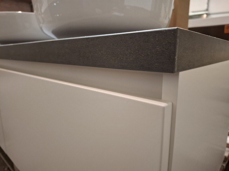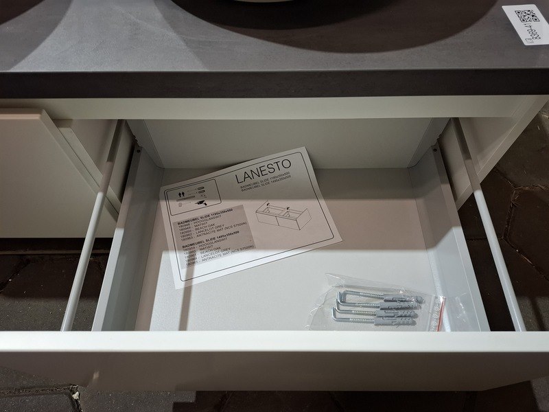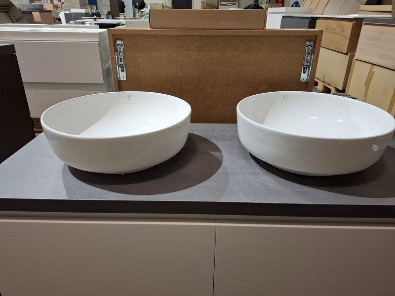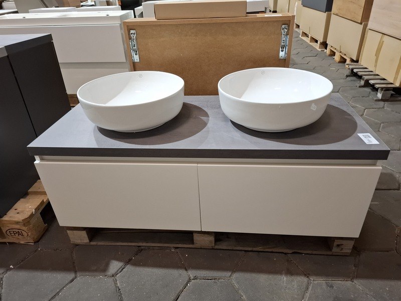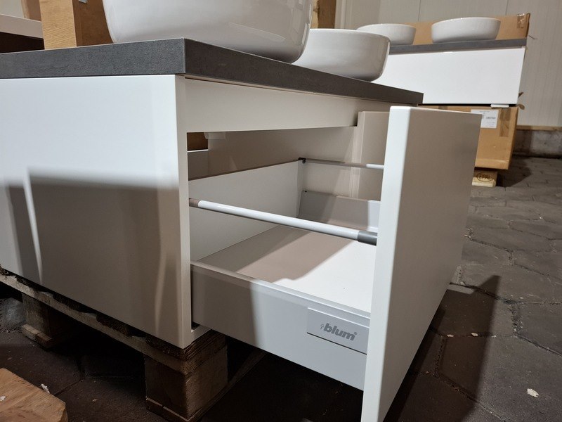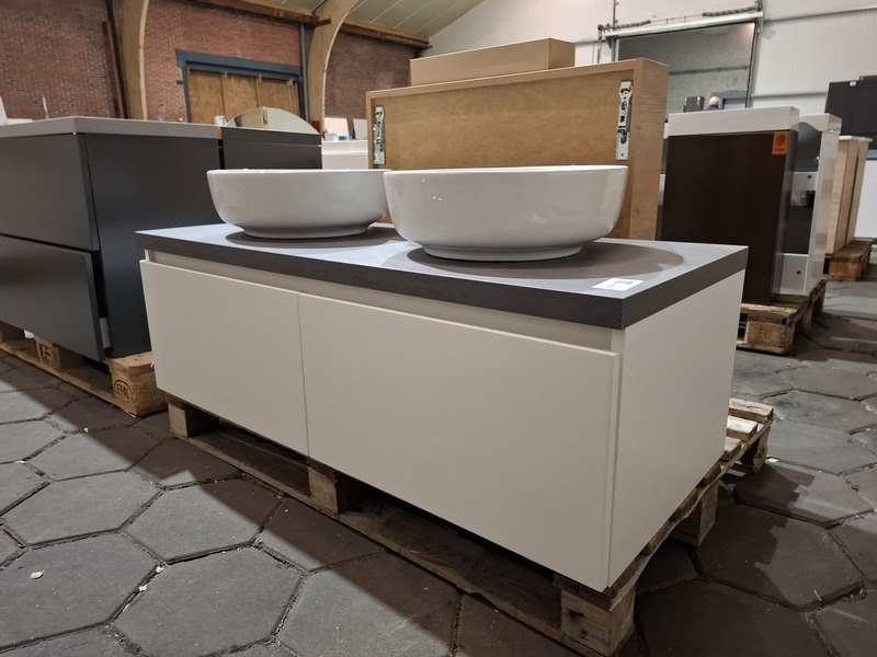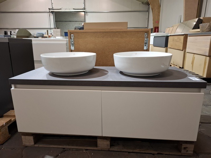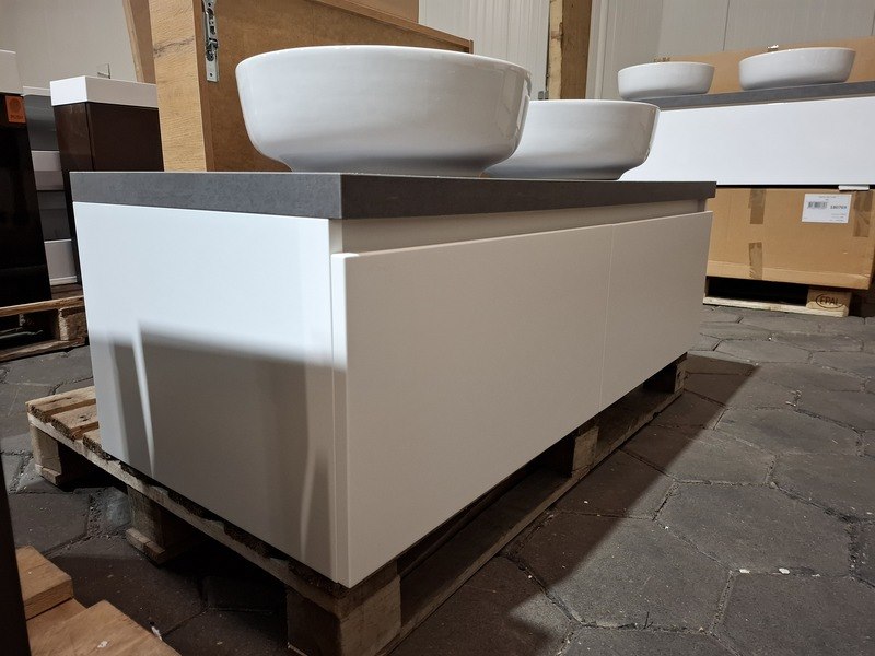 Product: Badmeubel Kleur: mat wit Afmeting: 120x46cm Specificaties: 2 lades met softclose, met Blum geleidesysteem, topblad, antraciet, 2x waskom, keramisch