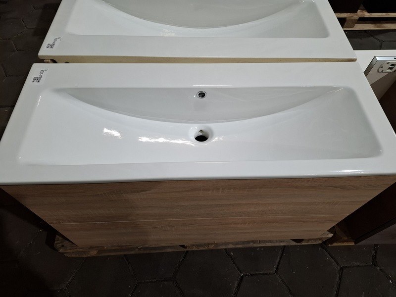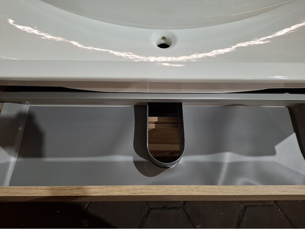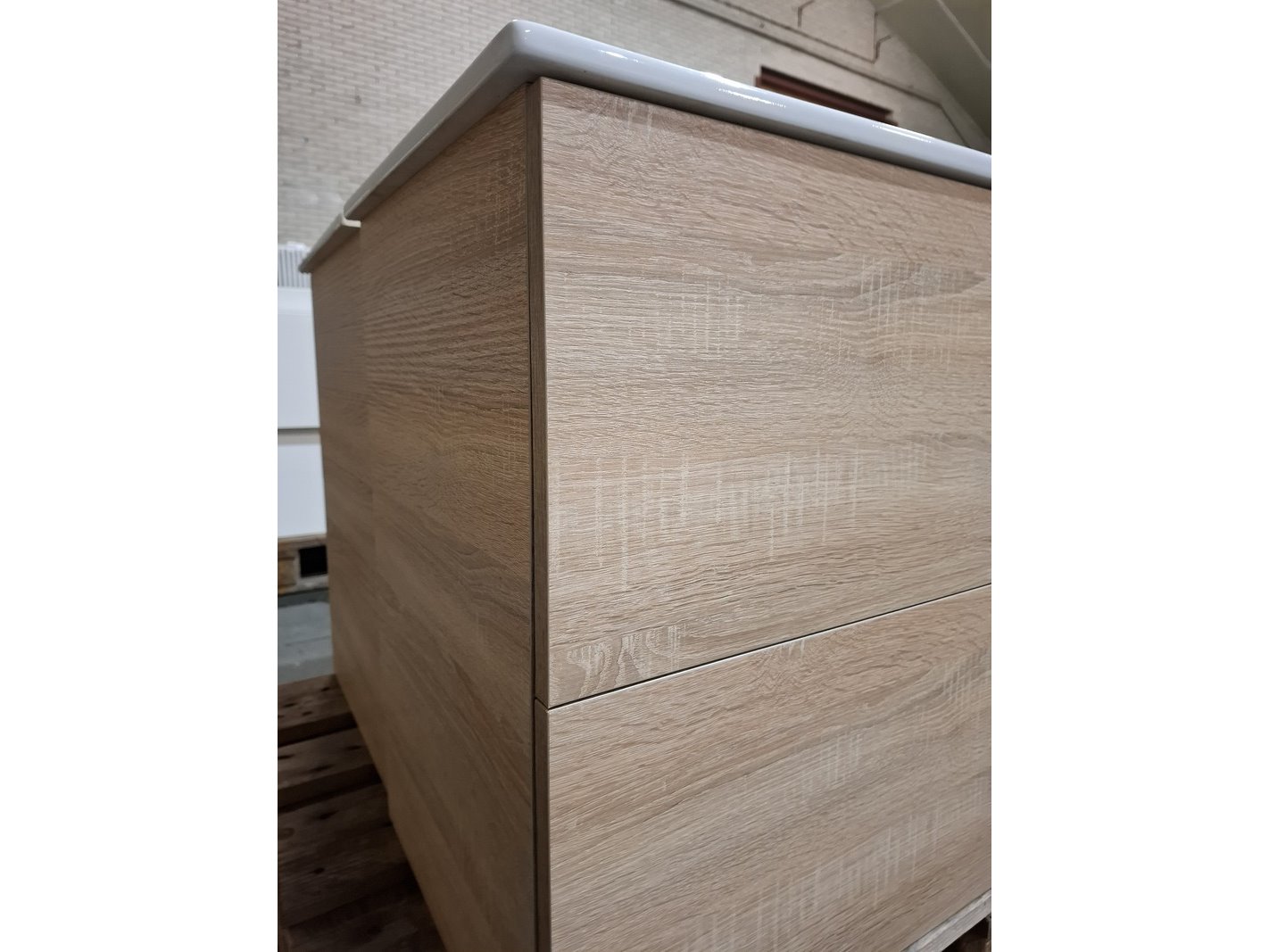 Product: Badmeubel Kleur: beach oak Afmeting: 80x40cm Specificaties: 2 lades met softclose, met Blum geleidesysteem, keramische wastafel, glans wit