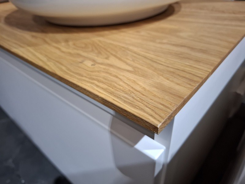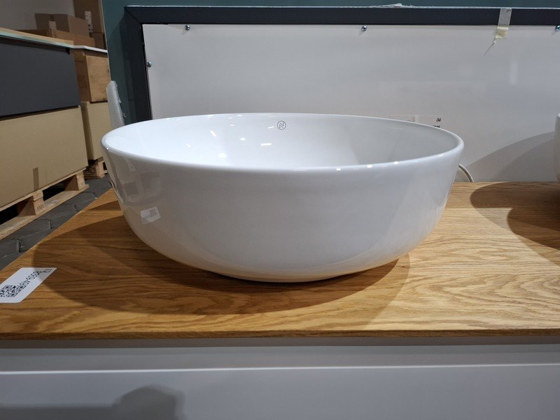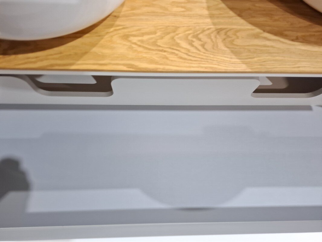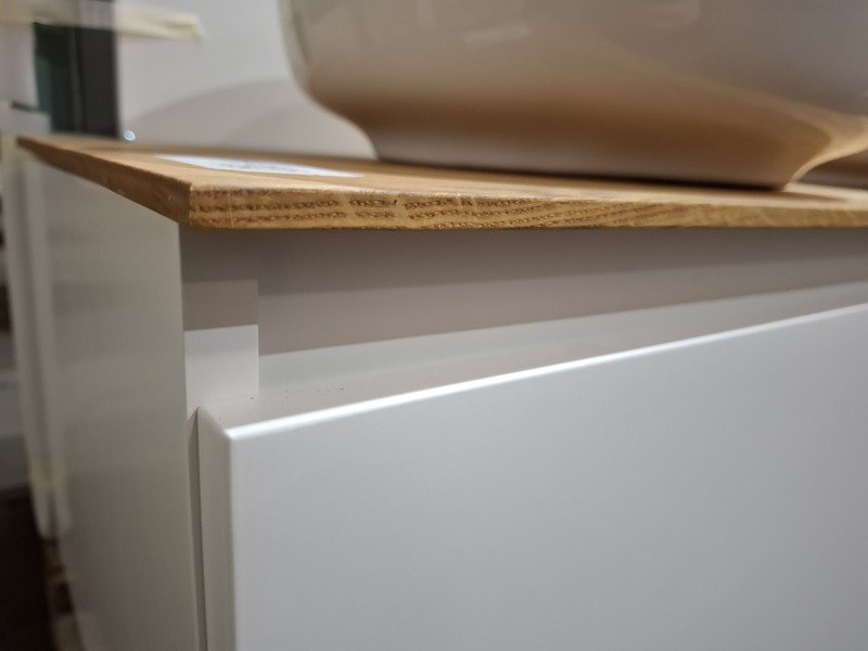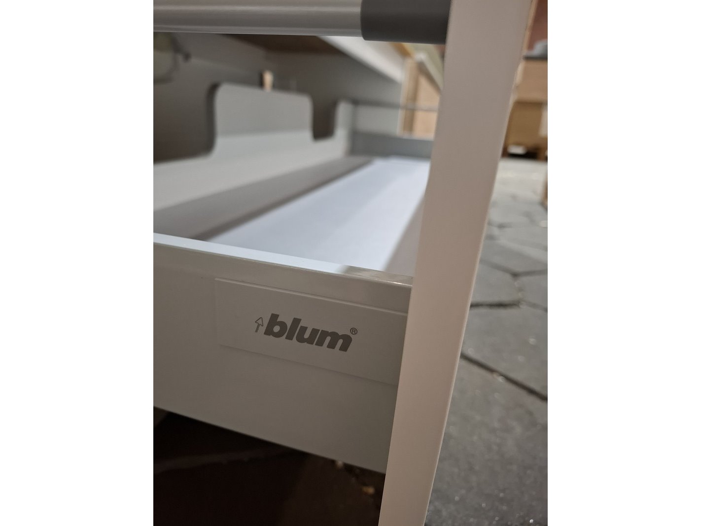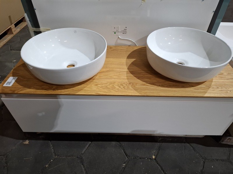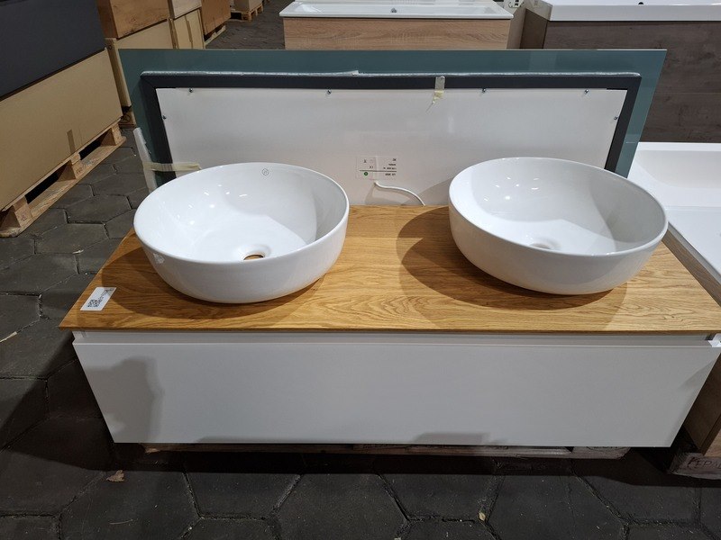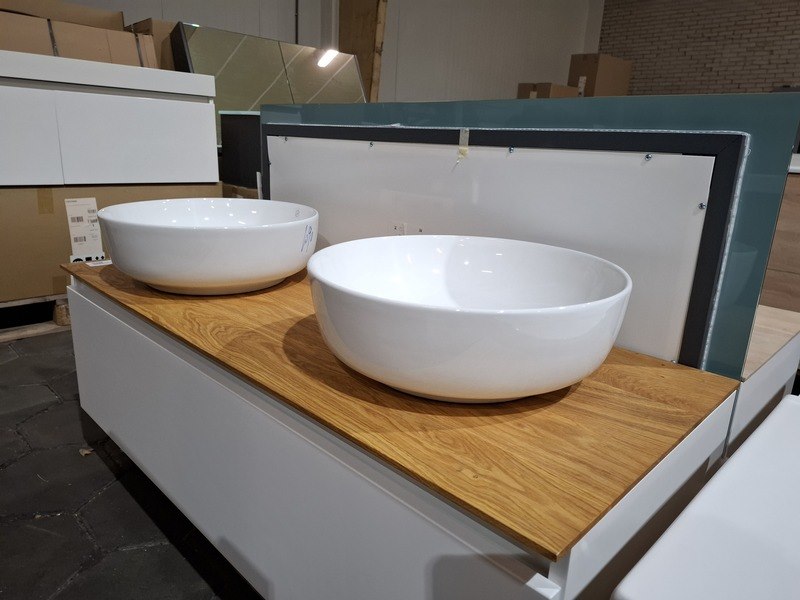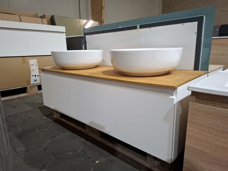 Product: Badmeubel Kleur: mat wit Afmeting: 120x46cm Specificaties: 1 lade met softclose, met Blum geleidesysteem, topblad noten, 2x waskom, keramisch, glans wit