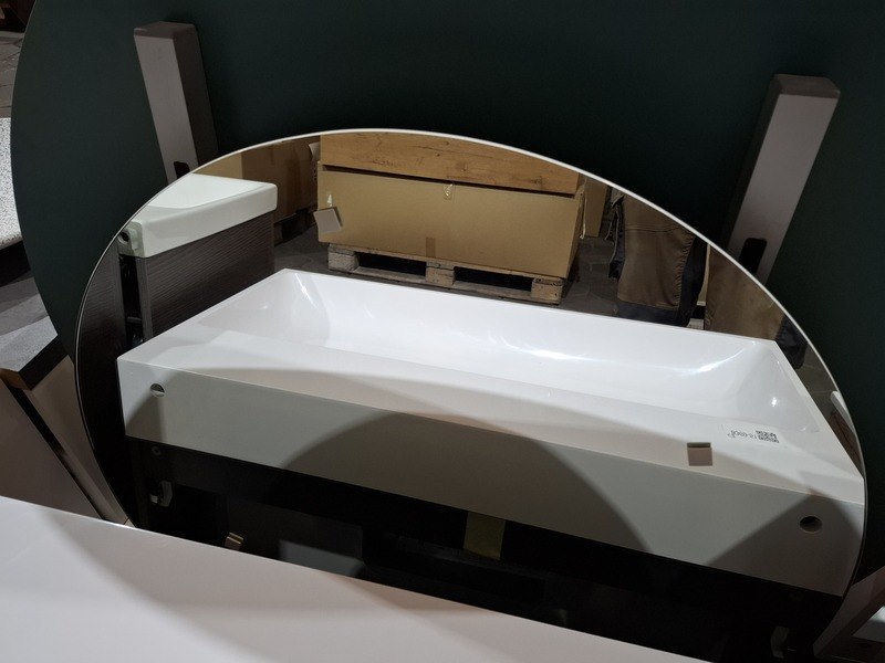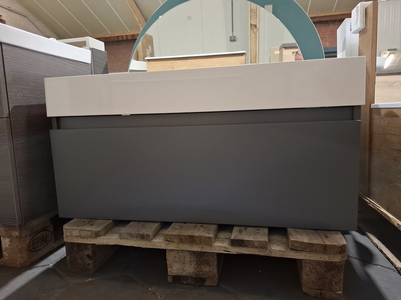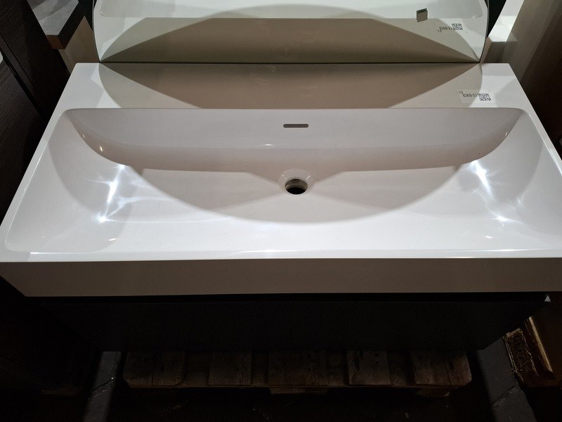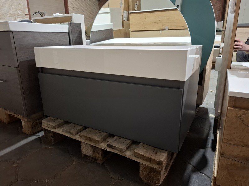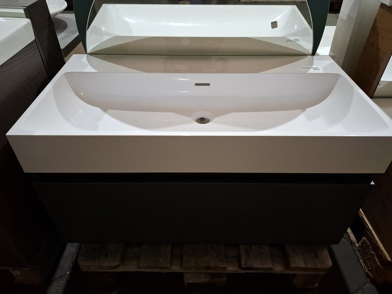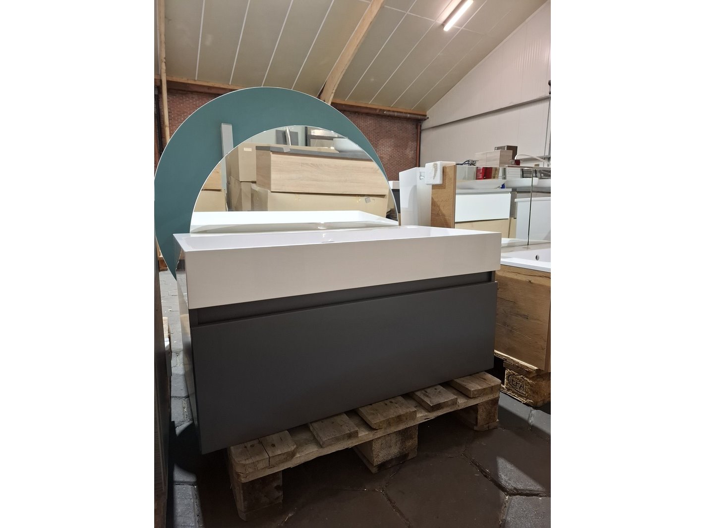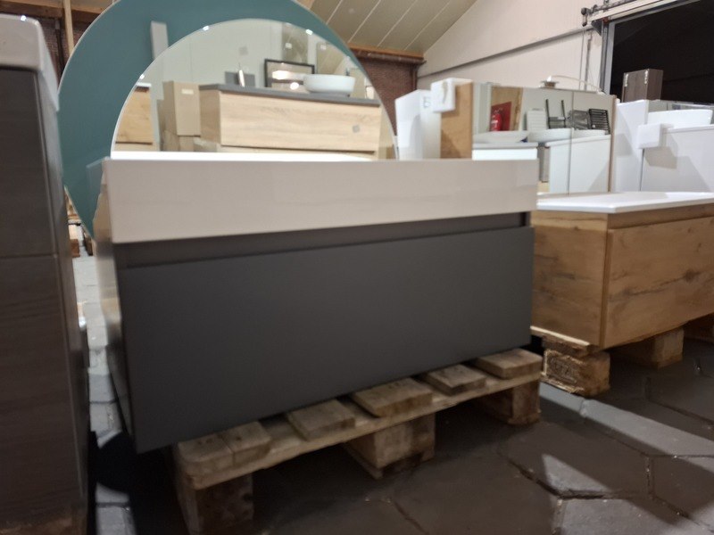 Product: Badmeubel Kleur: mat antraciet Afmeting: 90x46cm Specificaties: 1 lade met softclose, met Blum geleidesysteem, polybeton wastafel, glans wit, ronde spiegel, LED verlichting rondom, spiegelverwarming, sensorbediening