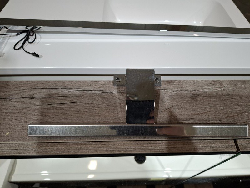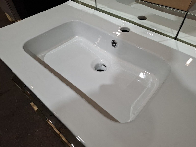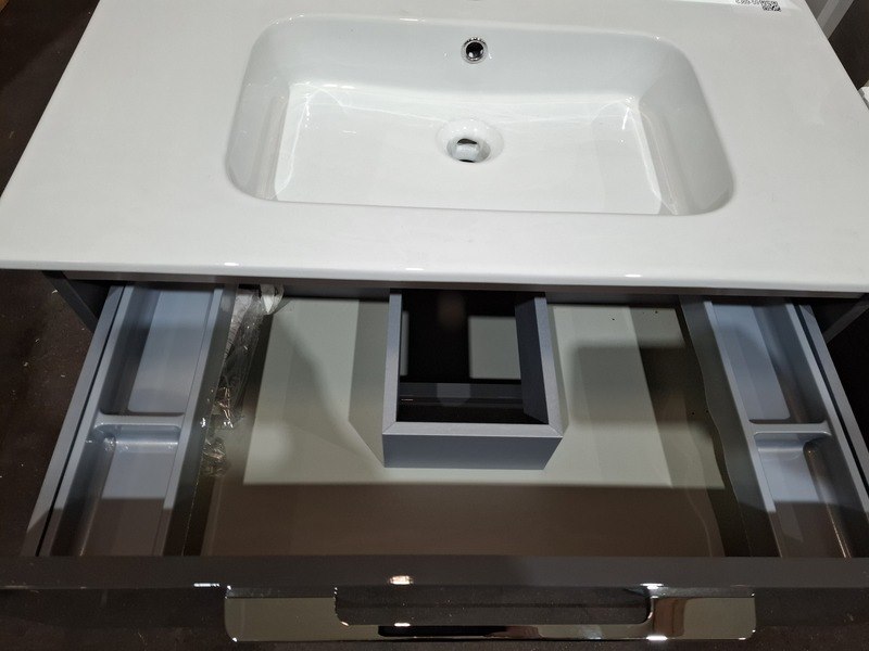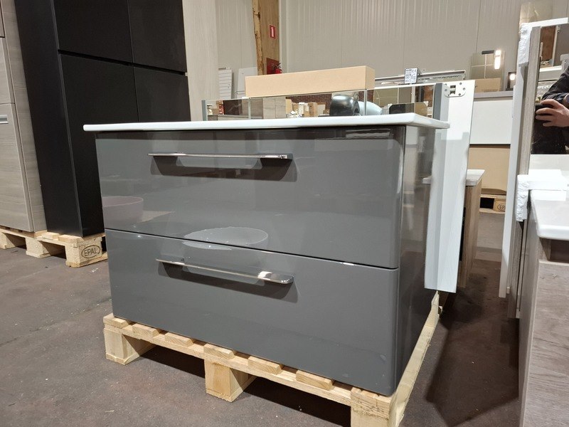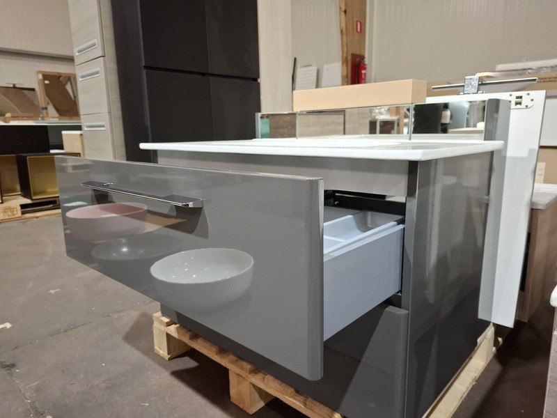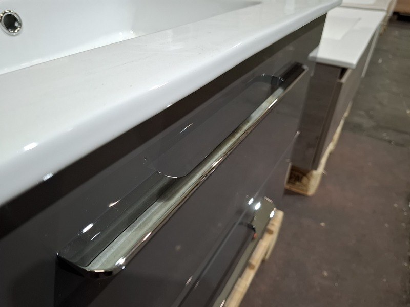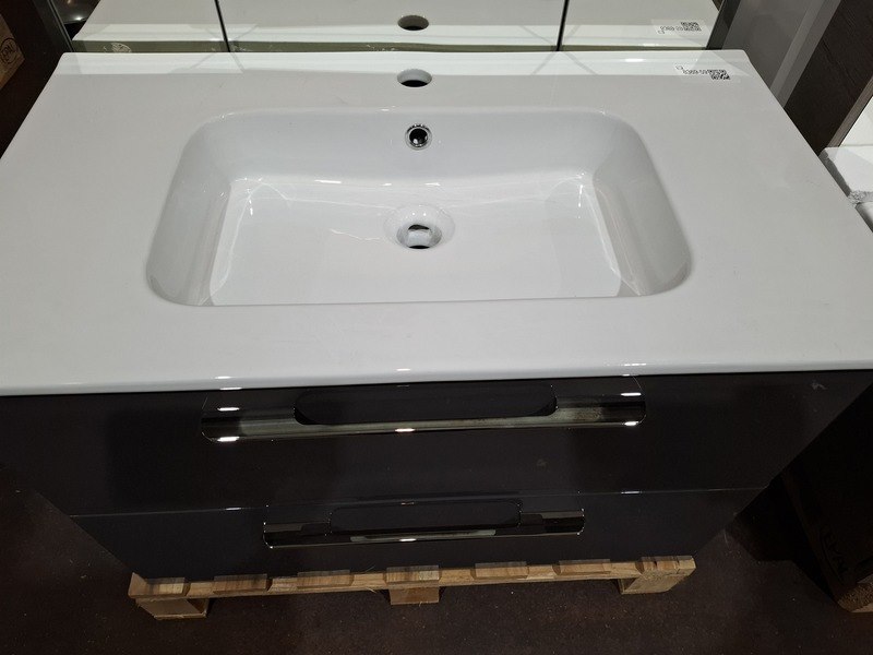 Product: Badmeubel Kleur: glans antraciet Afmeting: 80x46cm Specificaties: 2 lades met softclose, chromen grepen, keramische wastafel, glans wit, spiegelkast, 3 deurtjes, softclose, spiegelverlichting, stopcontact