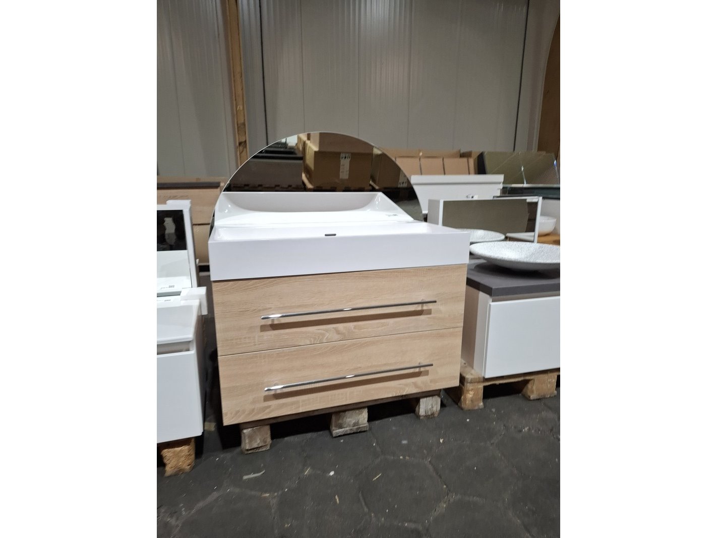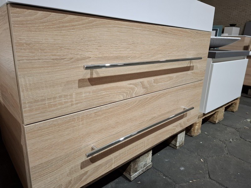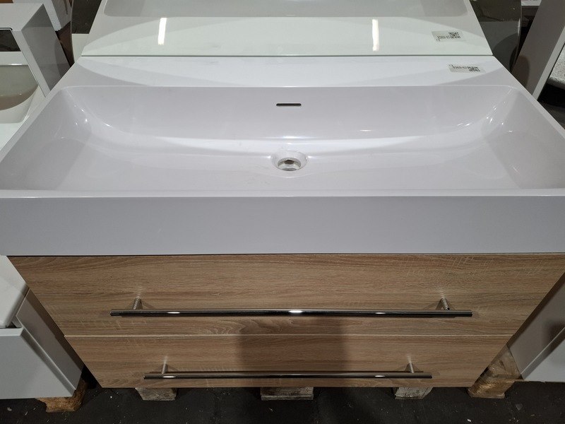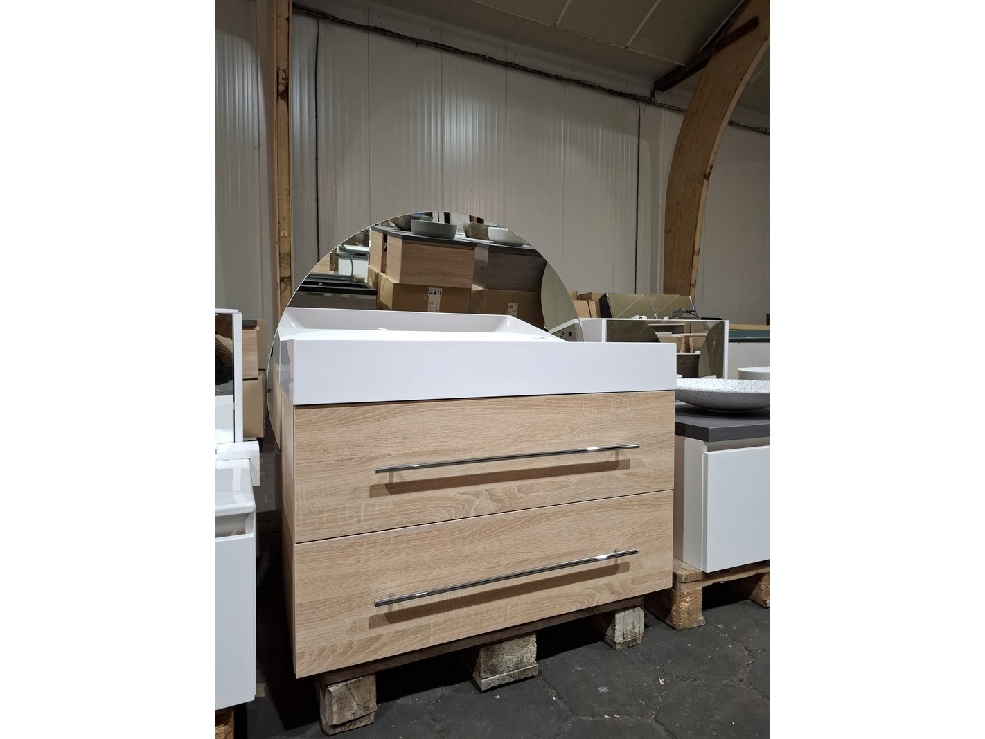 Product: Badmeubel Kleur: beach oak Afmeting: 90x46cm Specificaties: 2 lades met softclose, met Blum geleidesysteem, chromen grepen, polybeton wastafel, glans wit, ronde spiegel 100cm