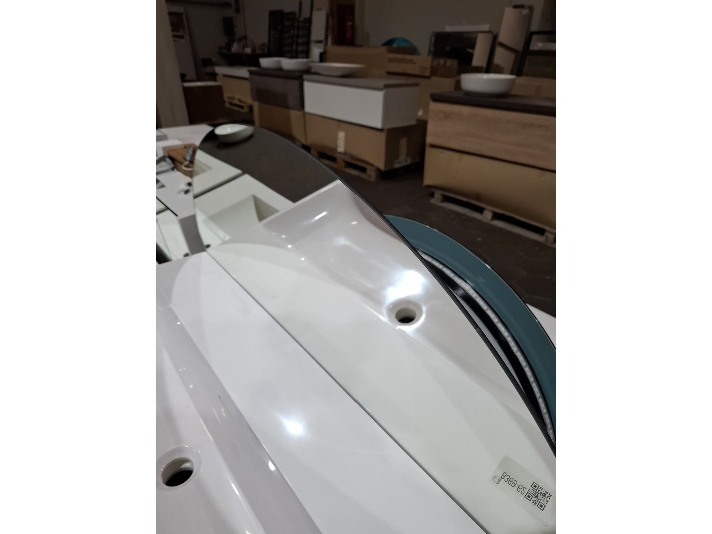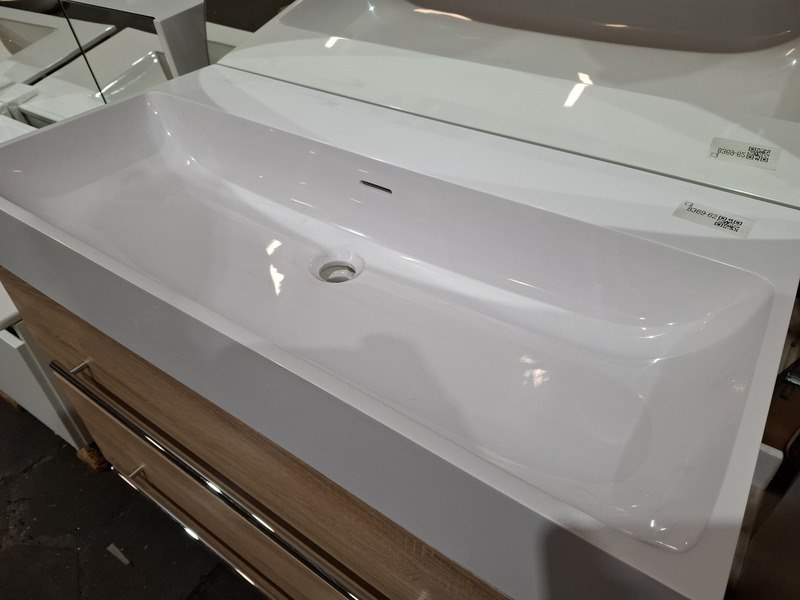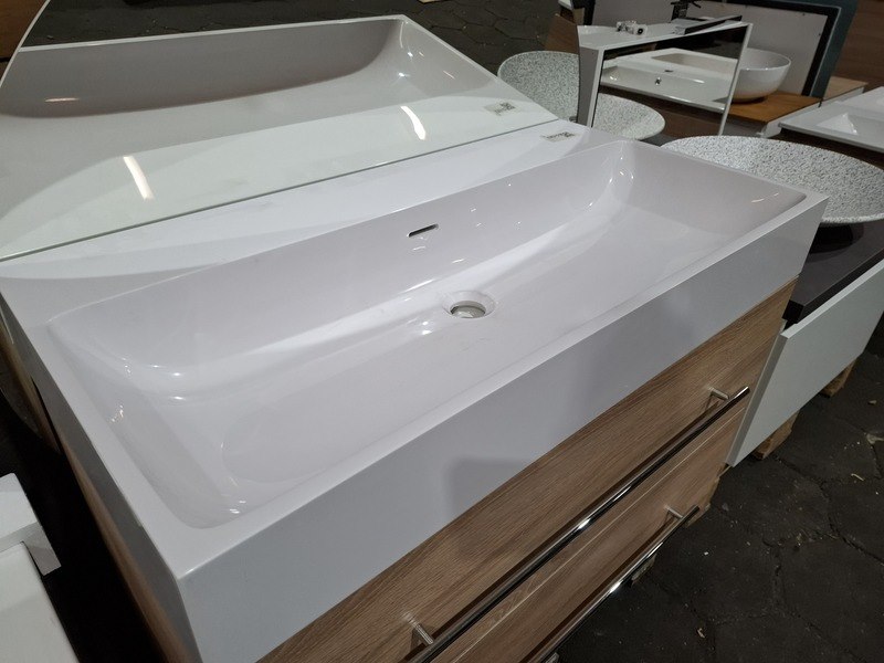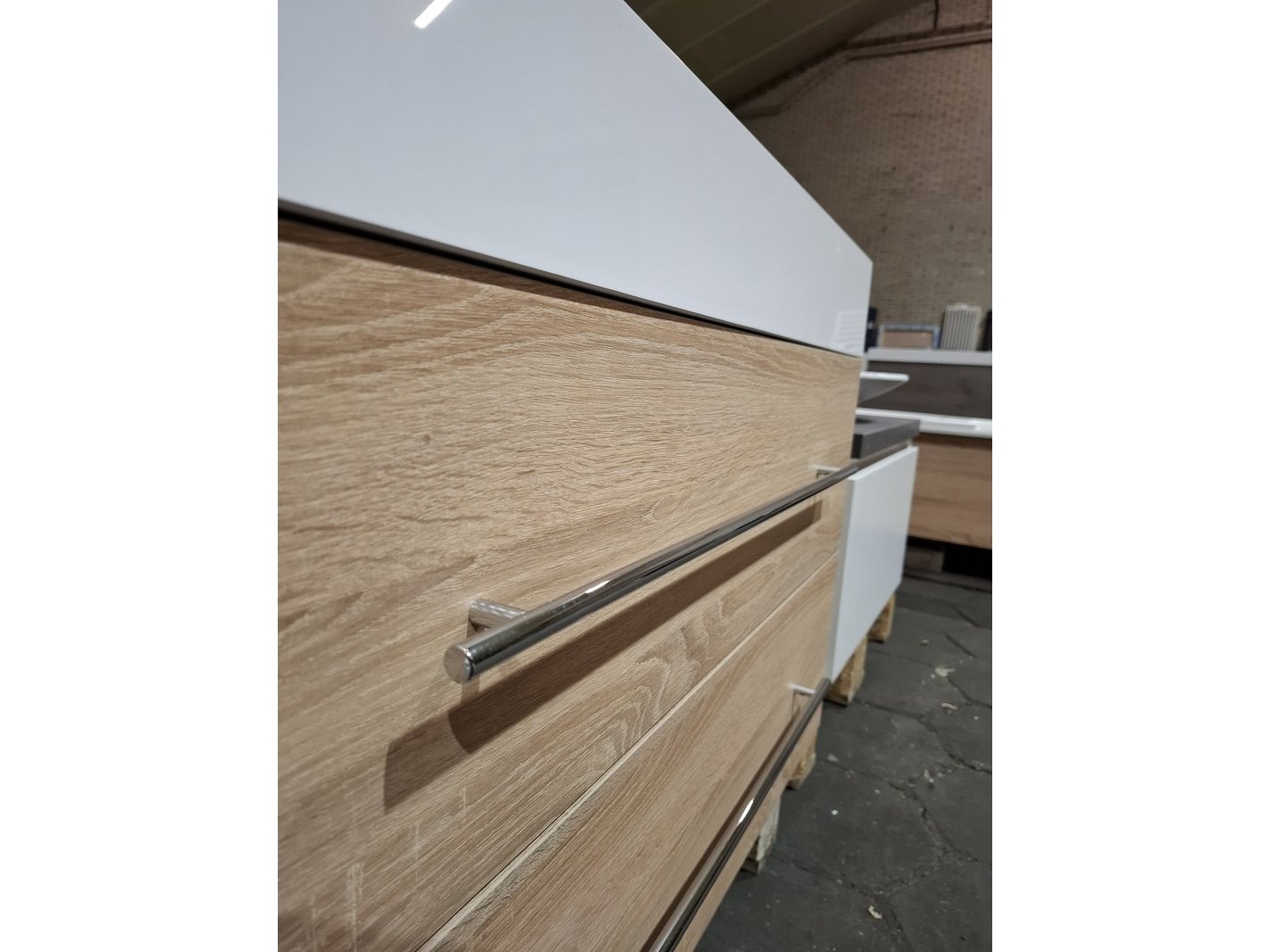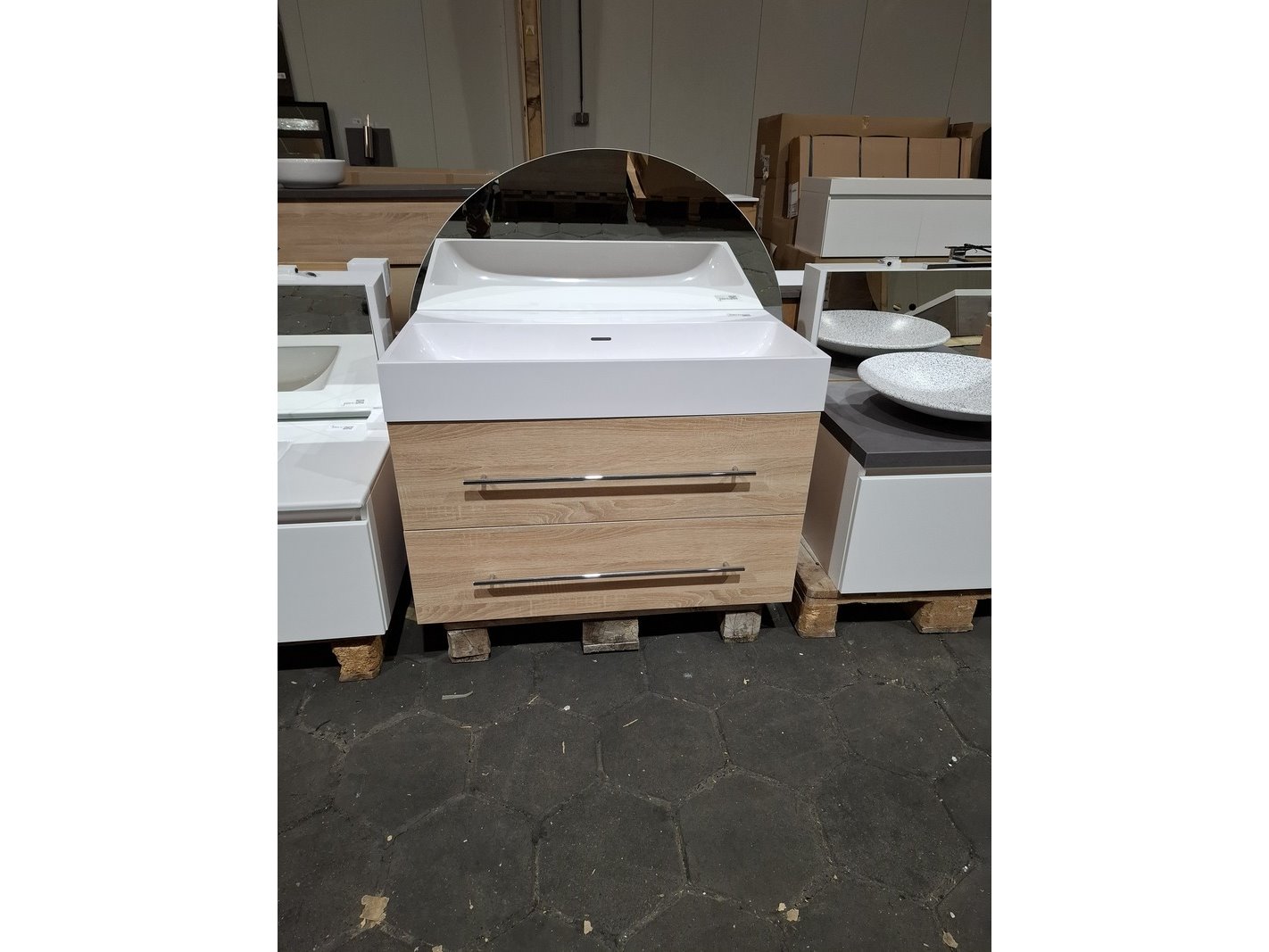Product: Badmeubel Kleur: beach oak Afmeting: 90x46cm Specificaties: 2 lades met softclose, met Blum geleidesysteem, chromen grepen, polybeton wastafel, glans wit, ronde spiegel 100cm