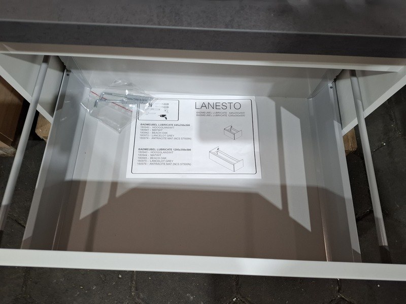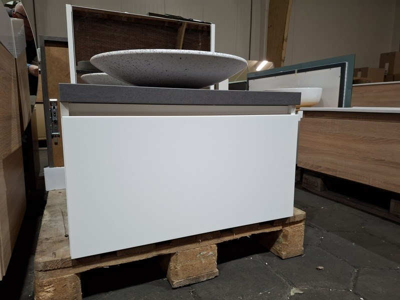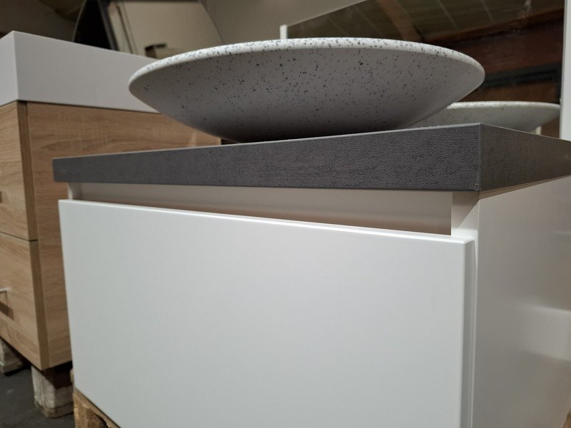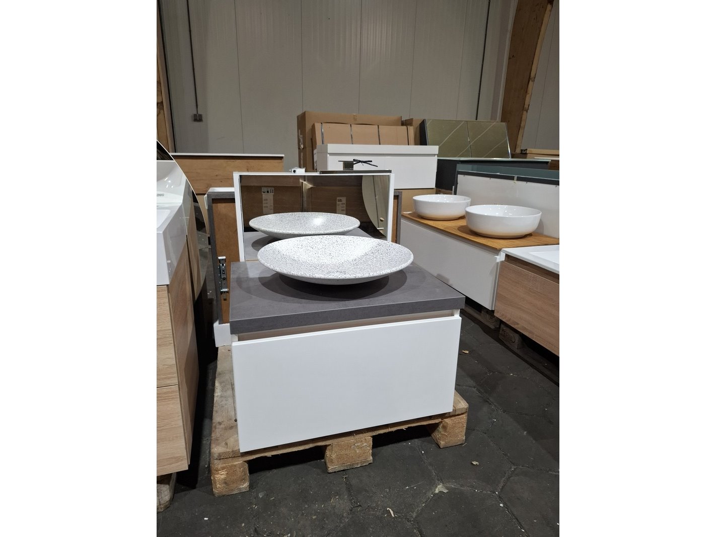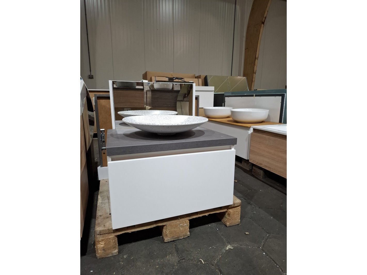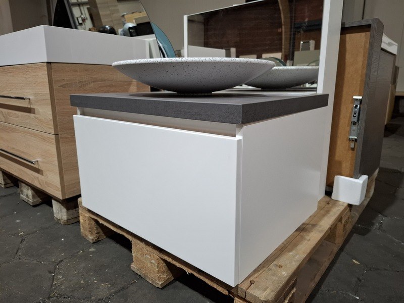 Product: Badmeubel Kleur: mat wit Afmeting: 65x50cm Specificaties: 1 lade met softclose, met Blum geleidesysteem, topblad antraciet, polybeton waskom, spiegelkast, 1 deurtje met softclose, spiegelverlichting